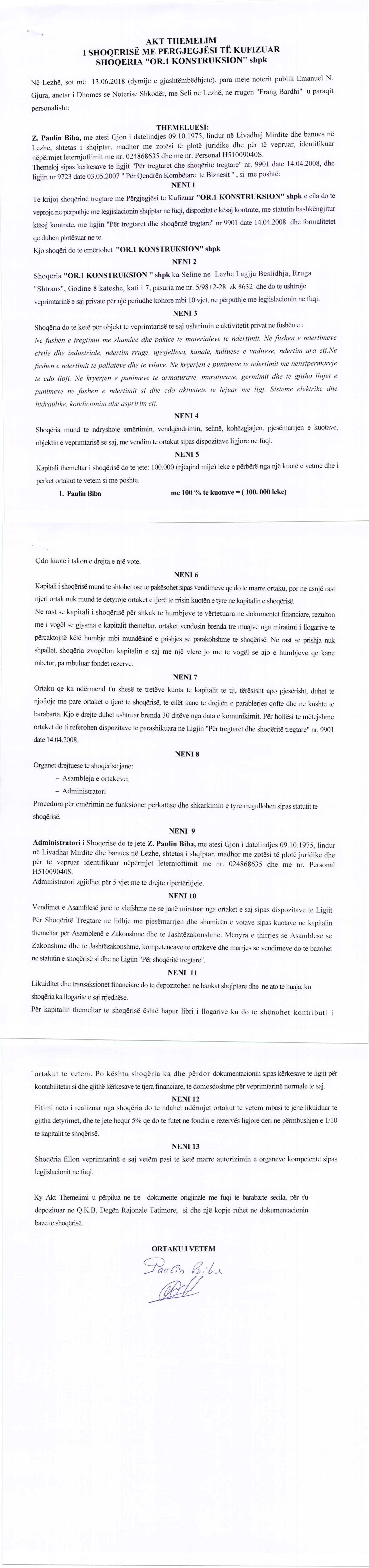 → Ekstrakt Historik i Regjistrit Tregtar date 28.10.2022 → Akt themelimi i Shoqerise |
