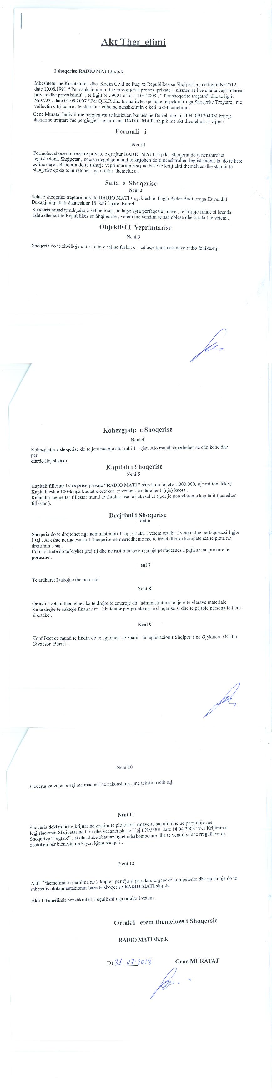 | Emërtime të tjera Tregtare: | "RADIO MATI" shpk |