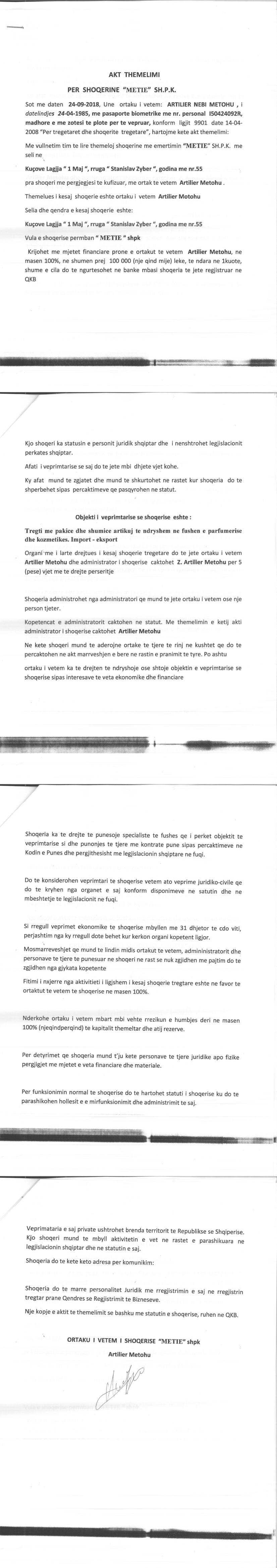 | Objekti i Veprimtarisë: | Tregti me pakice dhe shumice artikuj te ndryshem ne fushen e parfumerise dhe kozmetikes. Import - eksport. Konsulence imobiliare dhe konsulence ne fushen e tregtise |