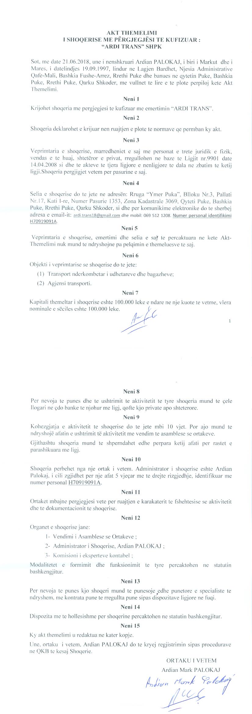 → Ekstrakt Historik i Regjistrit Tregtar date 28.10.2022 → Akt themelimi i Shoqerise |