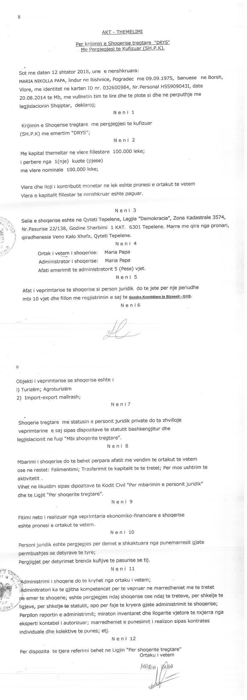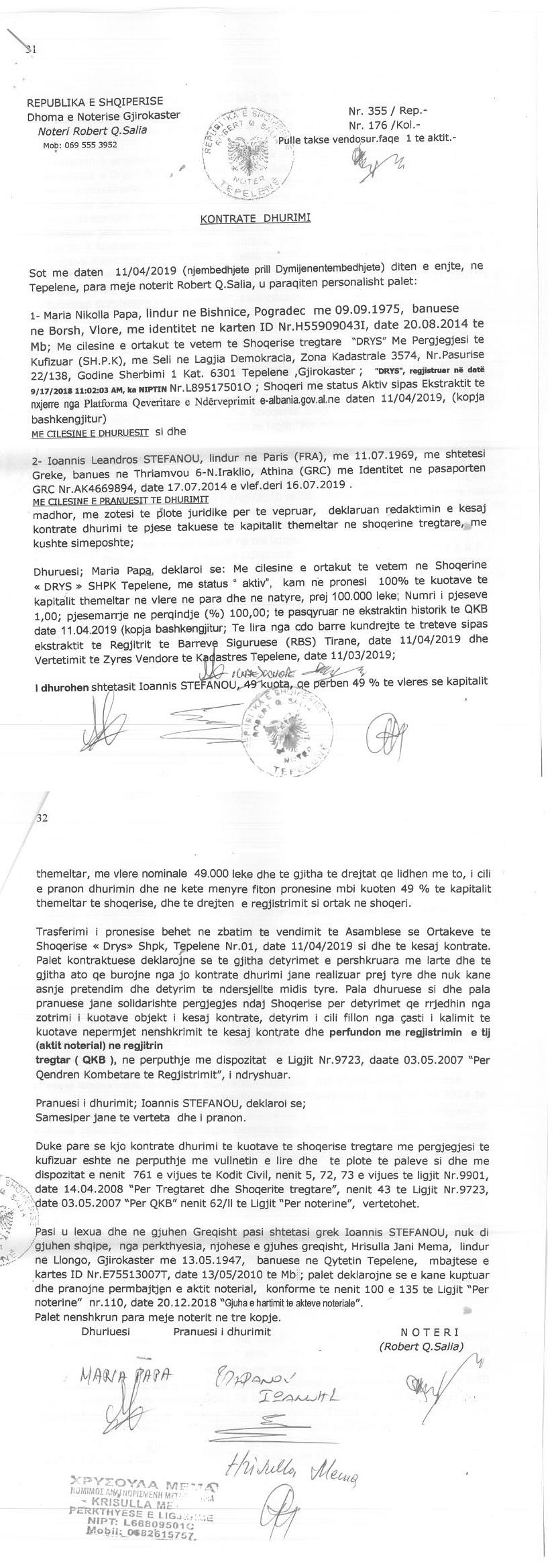 → Ekstrakti Historik i Regjistrit Tregtar date 01.12.2022 → Akt themelimi i Shoqerise → Kontrate Dhurimi Kuotash date 11.04.2019 → Ekstrakti Historik i Regjistrit te Pronareve Perfitues date 01.12.2022 |