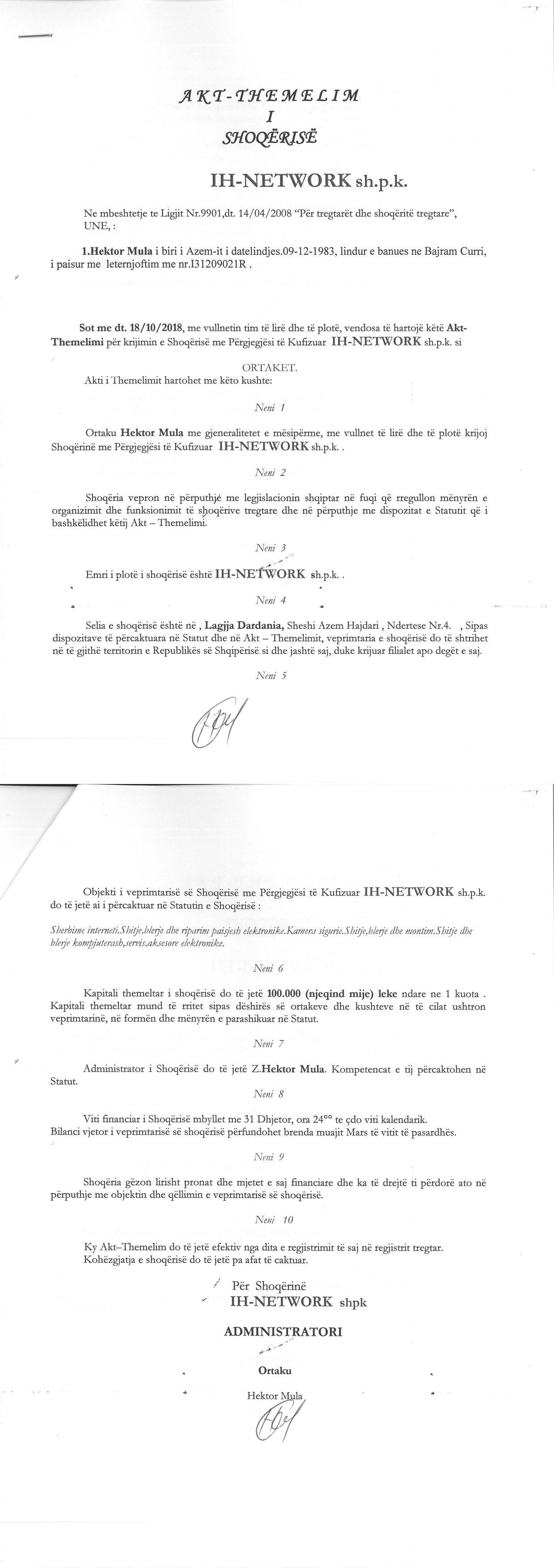 → Ekstrakt historik i regjistrit tregtar date 07.10.2021 → Ekstrakti Historik i Regjistrit Tregtar date 13.12.2022 → Akt themelimi i Shoqerise |