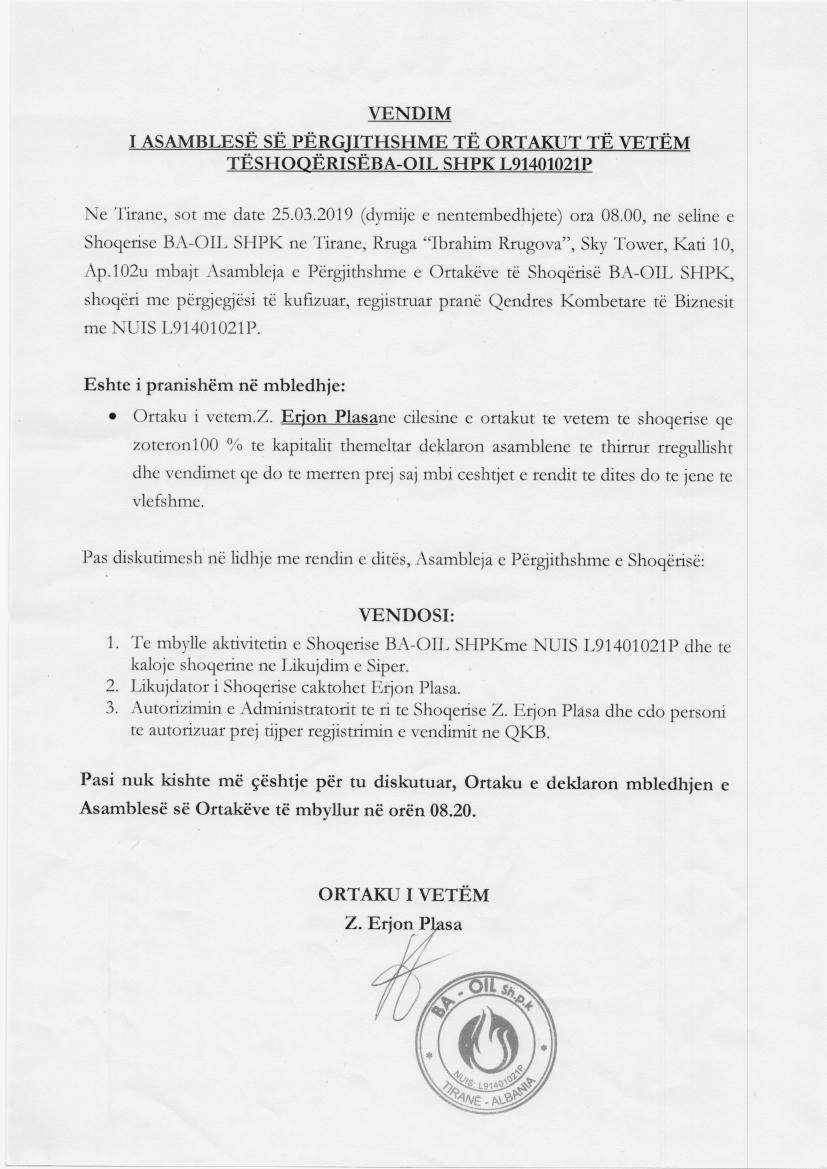 → Ekstrakt historik i regjistrit tregtar 24.11.2019 → Kontrate shit-blerje kuotash 06.02.2019 → Vendimi per caktimin e Likuidatorit |