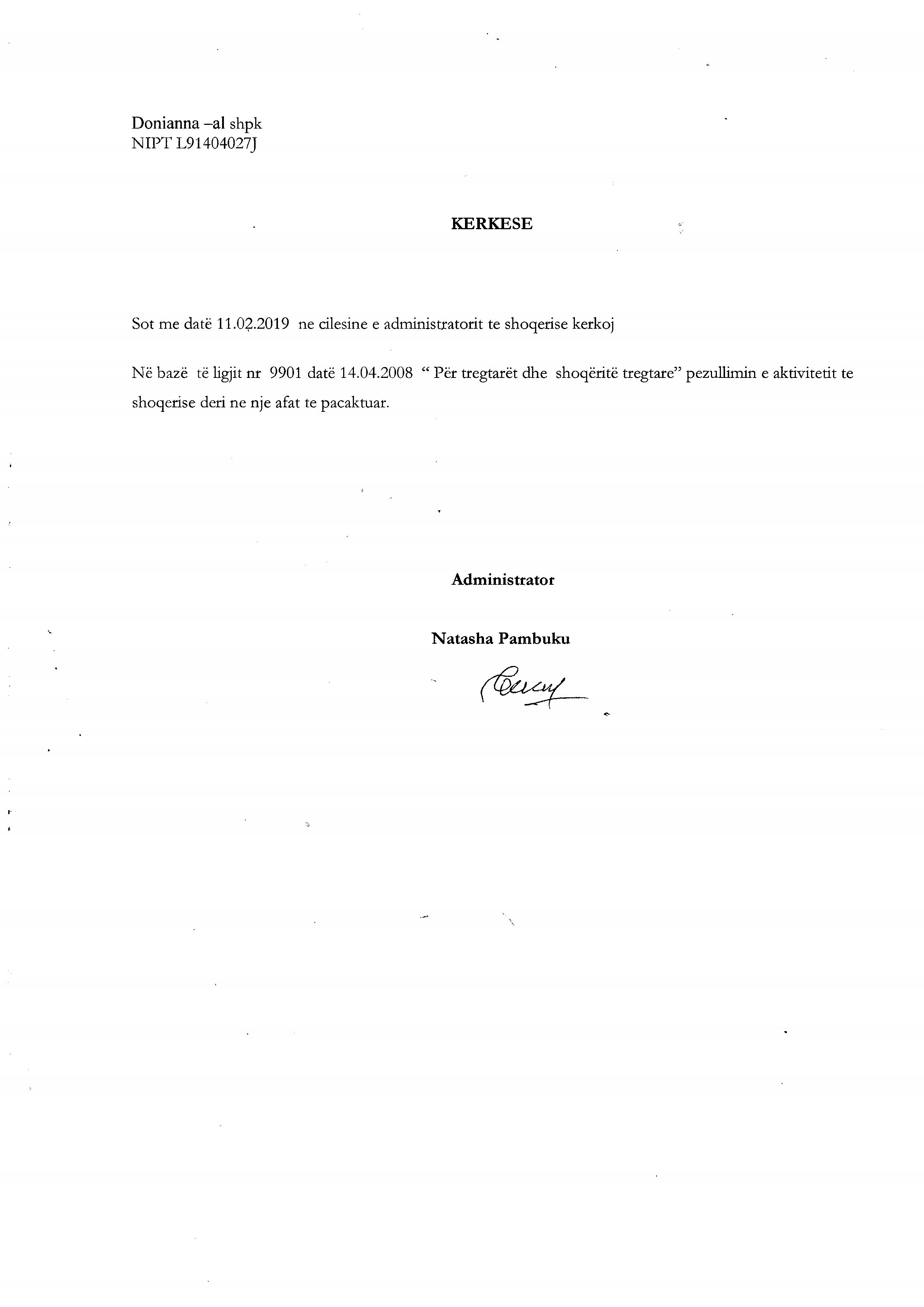 | Çështje Ligjore: | Më datë 11.02.2019, me vendim të administratores Natasha Pambuku, u pezullua aktiviteti i shoqërisë për një afat të papërcaktuar. Statusi ndryshoi nga “Aktiv” në statusin “Pezulluar”. Më datë 15.03.2019, me vendim të administratores Natasha Pambuku, rifilloi aktivitetit i shoqërisë. Statusi ndryshoi nga “Pezulluar” në “Aktiv”. |