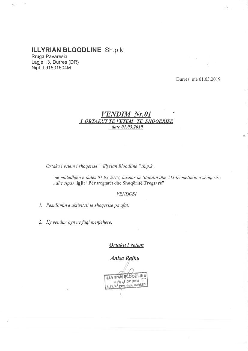 | Çështje Ligjore: | I. Më datë 01.03.2019, me vendim të ortakut të vetëm, u pezullua pa afat aktiviteti i shoqërisë. II. Më datë 20.06.2019, me kërkesë të administratorit, u riaktiviua aktiviteti i shoqërisë. III. Më datë 30.10.2023 me ane te Kërkesës Nr. 13120 Prot, datë 30.10.2023, “ Njoftim për Vendosjen e Barrës Siguruese mbi titujt e pronësisë”, ardhur nga Drejtoria e të Ardhurave Vendore, Bashkia Vlorë, u kerkua: Vendosje e Barrës Siguruese mbi titujt e pronësisë së tatimpaguesit “ ILLYRIAN BLOODLINE ” SH.P.K, pajisur me NUIS (NIPT- L91501504M. |