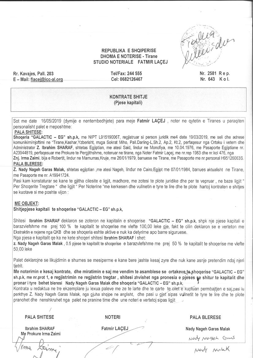 → Ekstrakt historik i regjistrit tregtar 15.01.2020 → Statuti i shoqerise → Kontrate shitje kuotash 16.05.2019 |