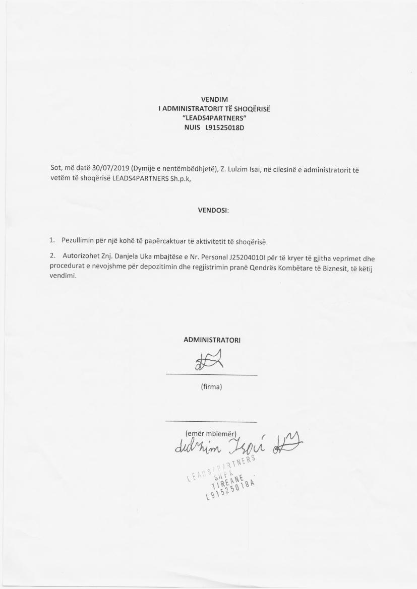 | Çështje Ligjore: | Më datë 30.07.2019, me vendim të asamblesë së ortakëve, u pezullua aktiviteti i shoqërisë për një kohë të papërcaktuar. |