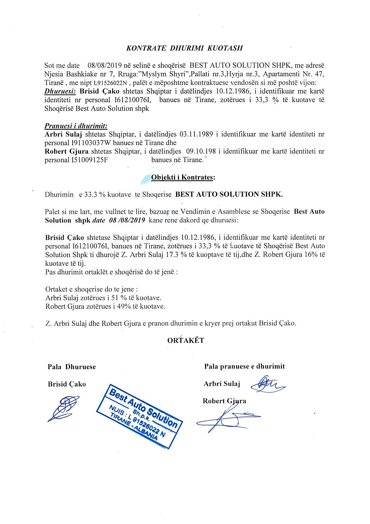 → Ekstrakt historik i regjistrit tregtar 17.01.2020 → Akti I themelimit → Kontrate dhurimi kuotash 08.08.2019 |