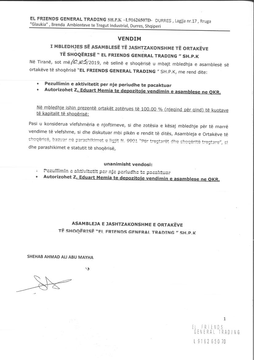 → Ekstrakt historik i regjistrit tregtar 01.02.2020 → Akti I themelimit → Vendimi per pezullimin e aktivitetit 10.05.2019 |