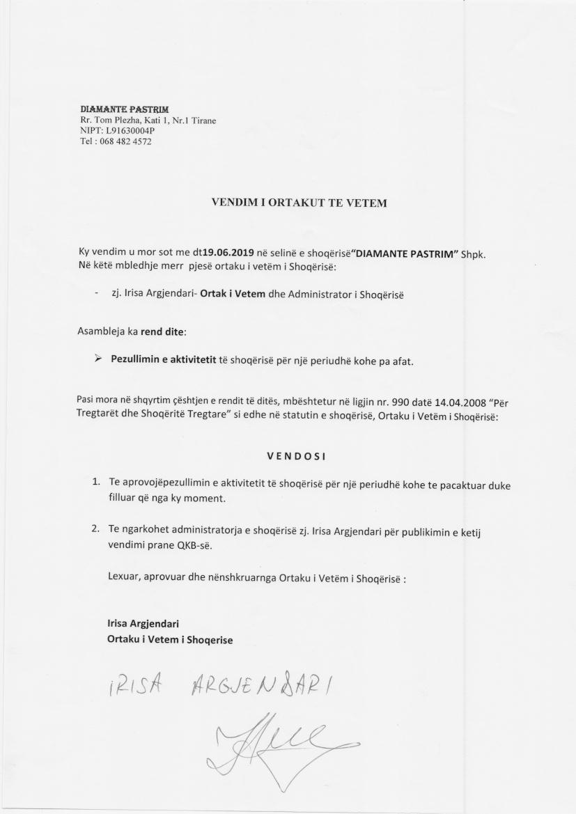 | Çështje Ligjore: | Më datë 19.06.2019, me vendim të ortakut të vetëm, u pezullua aktiviteti i shoqërisë për një periudhë kohe pa afat. |