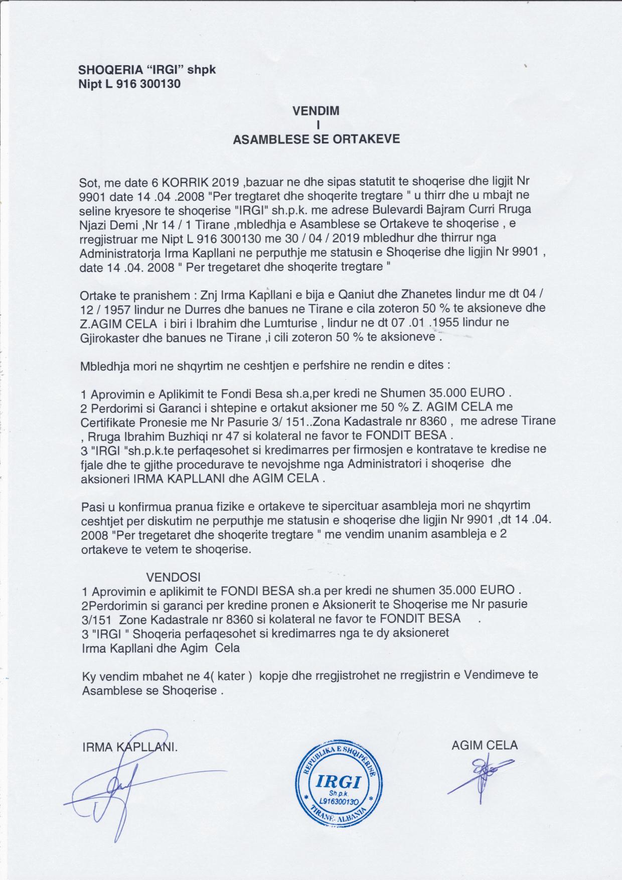 | Çështje Ligjore: | Më datë 06.07.2019, me vendim të asamblesë së ortakëve, u aprovua aplikimi te Fondi Besa sha për kredi në shumën 35.000 Euro. U përdor si garanci për kredinë prona e aksionerit të shoqërisë me nr. pasurie 3/151 zonë kadastrale nr. 8360 si kolateral në favor të Fondit Besa. Më datë 14.08.2019, u pezullua aktiviteti i shoqërisë për një periudhë të pacaktuar. |