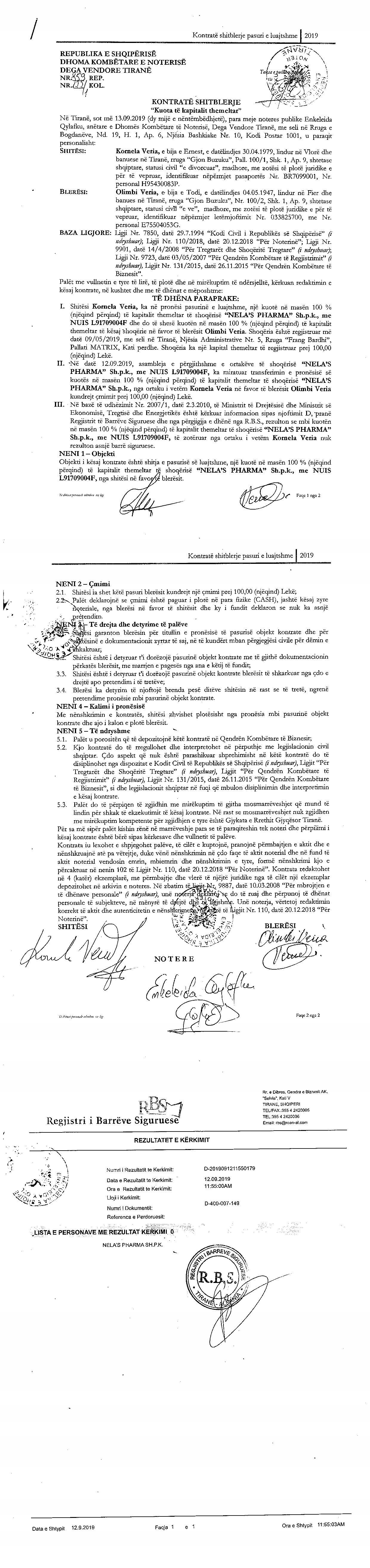 → Ekstrakt historik i regjistrit tregtar 06.02.2020 → Akti i themelimit → Kontrate shit-blerje kuotash 13.09.2019 |