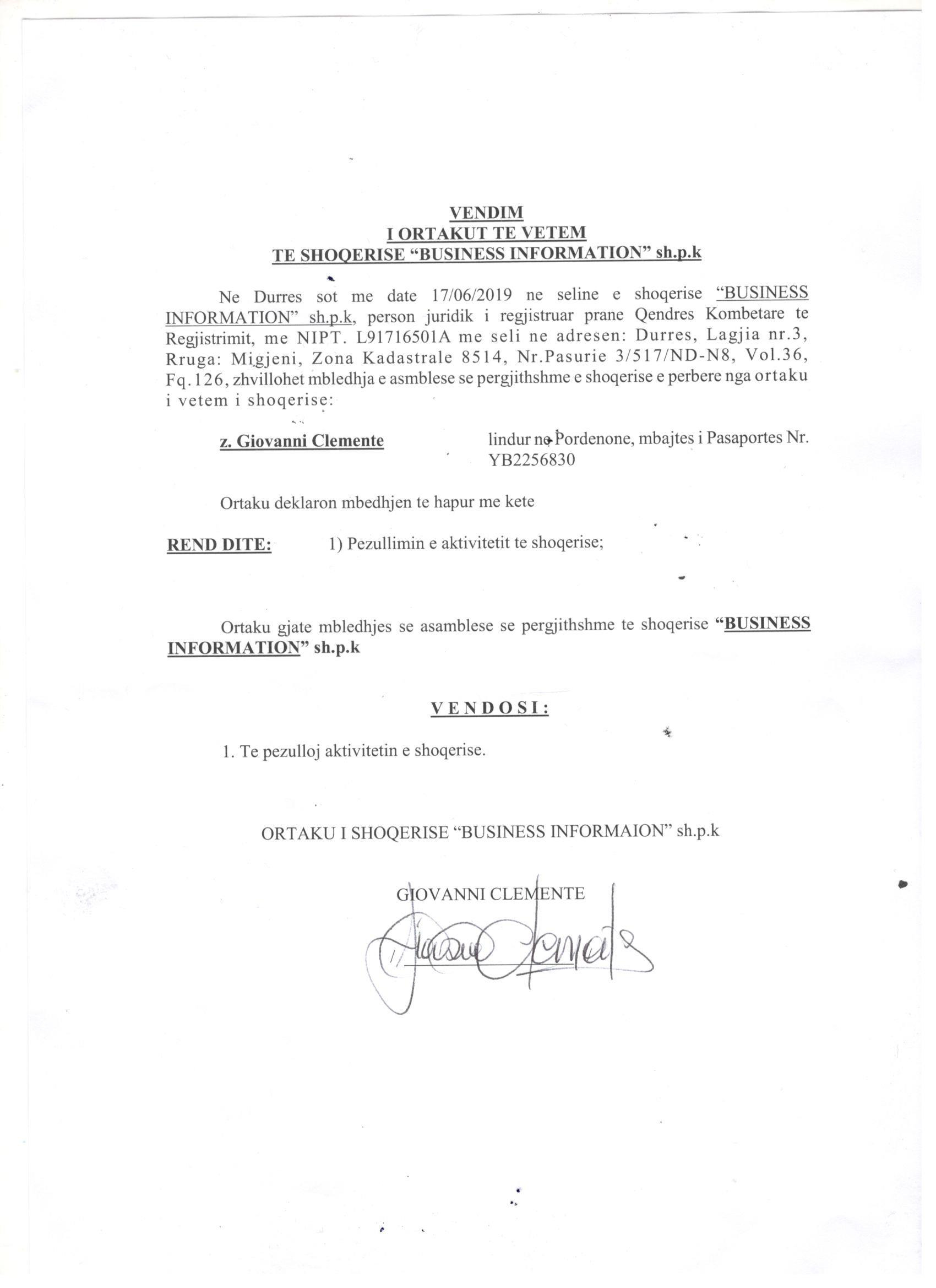 → Ekstrakt historik i regjistrit tregtar 10.02.2020 → Statuti I shoqerise → Vendimi per pezullimin e aktivitetit te shoqerise 17.06.2019 |