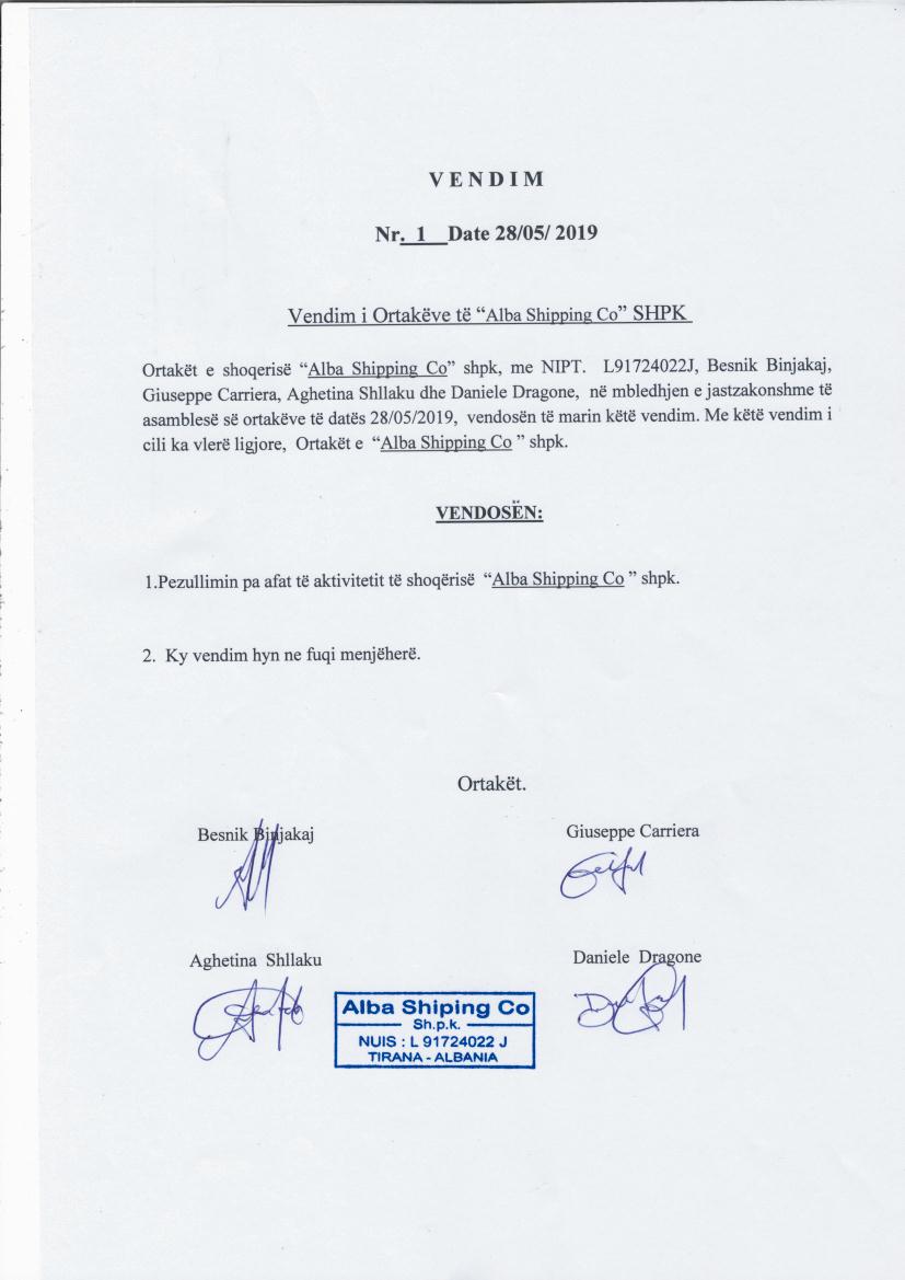 | Çështje Ligjore: | I. Më datë 28.05.2019, me vendim të ortakëve, u pezullua aktiviteti i shoqërisë pa një afat të përcaktuar. II. Më datë 04.09.2019, me vendim të ortakëve, u riaktivizua veprimtaria e shoqërisë. III. Më datë 16.12.2019, me vendim të ortakëve, u pezullua aktiviteti i shoqërisë pa afat. |