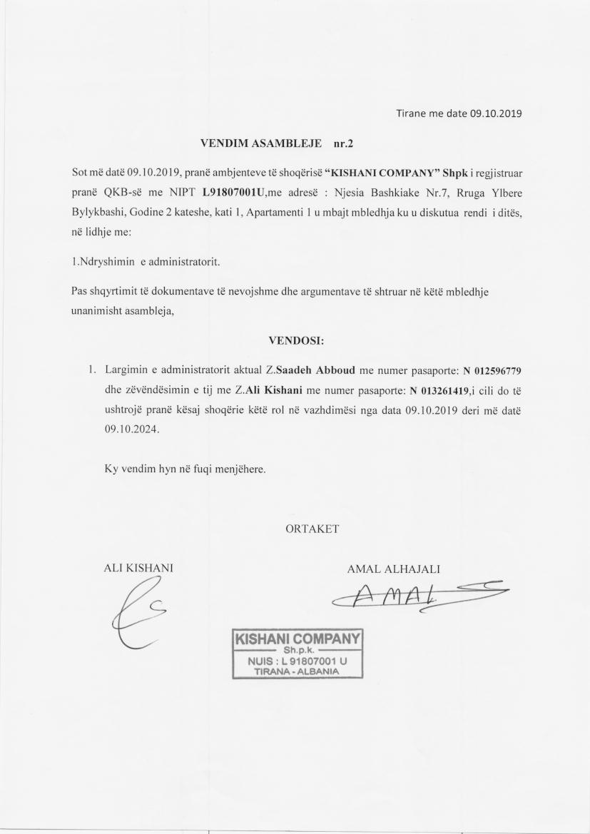 → Ekstrakti historik I regjistrit tregtar 15.10.201 → Statuti I shoqerise → Vendimi I asamblese date 09.10.2019 |