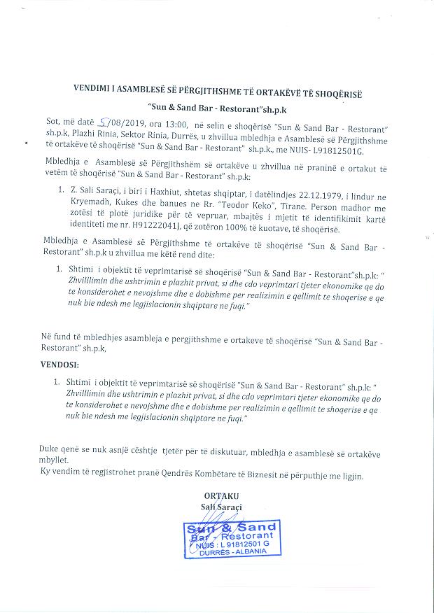 | Emërtime të tjera Tregtare: | ''Sun & Sand Bar - Restorant'' |