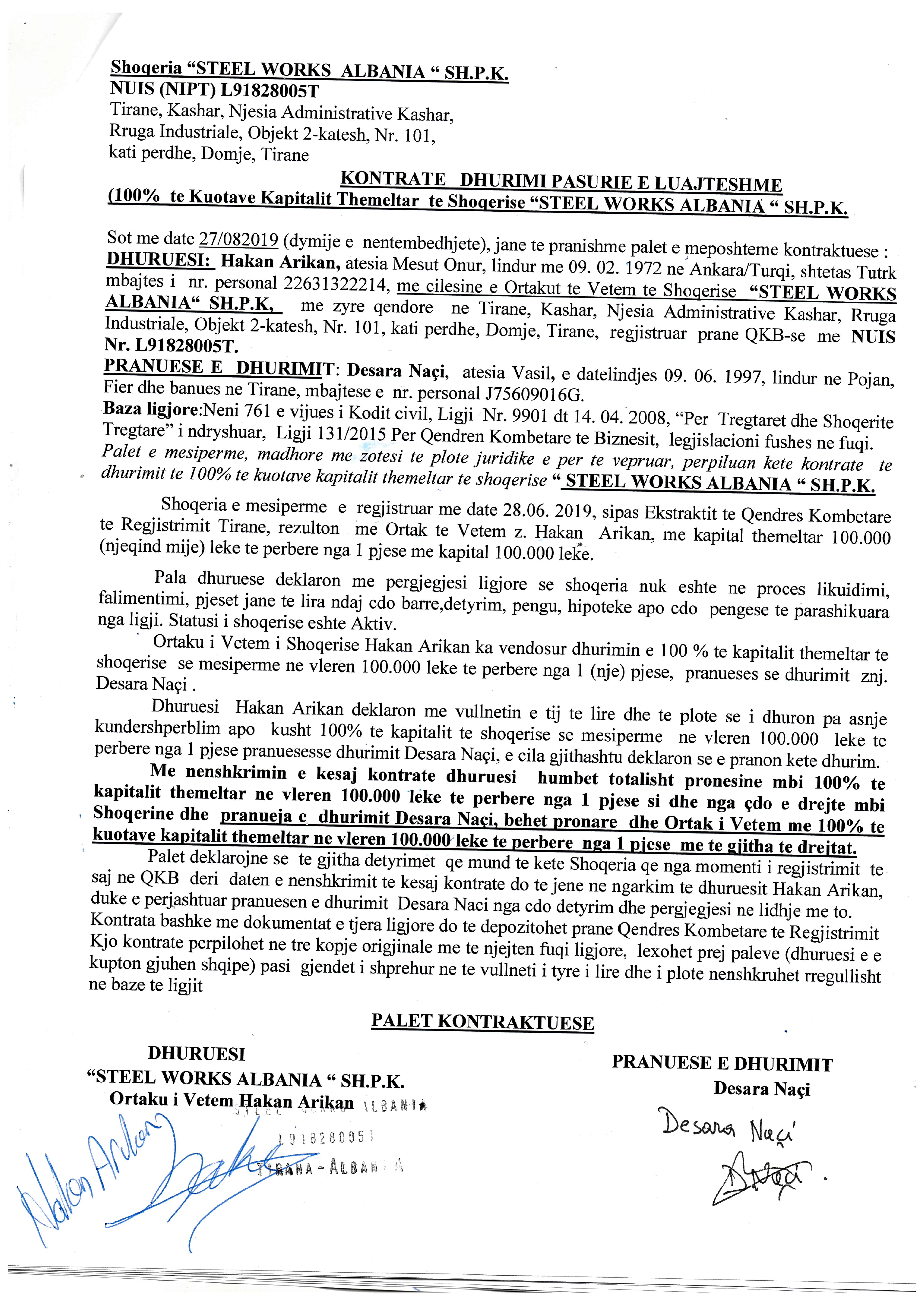 → Ekstrakti historik I regjistrit tregtar 25.10.2019 → Akti i themelimit → Kontrata e dhurimit te pasurive te luajteshme date 27.08.2019 |