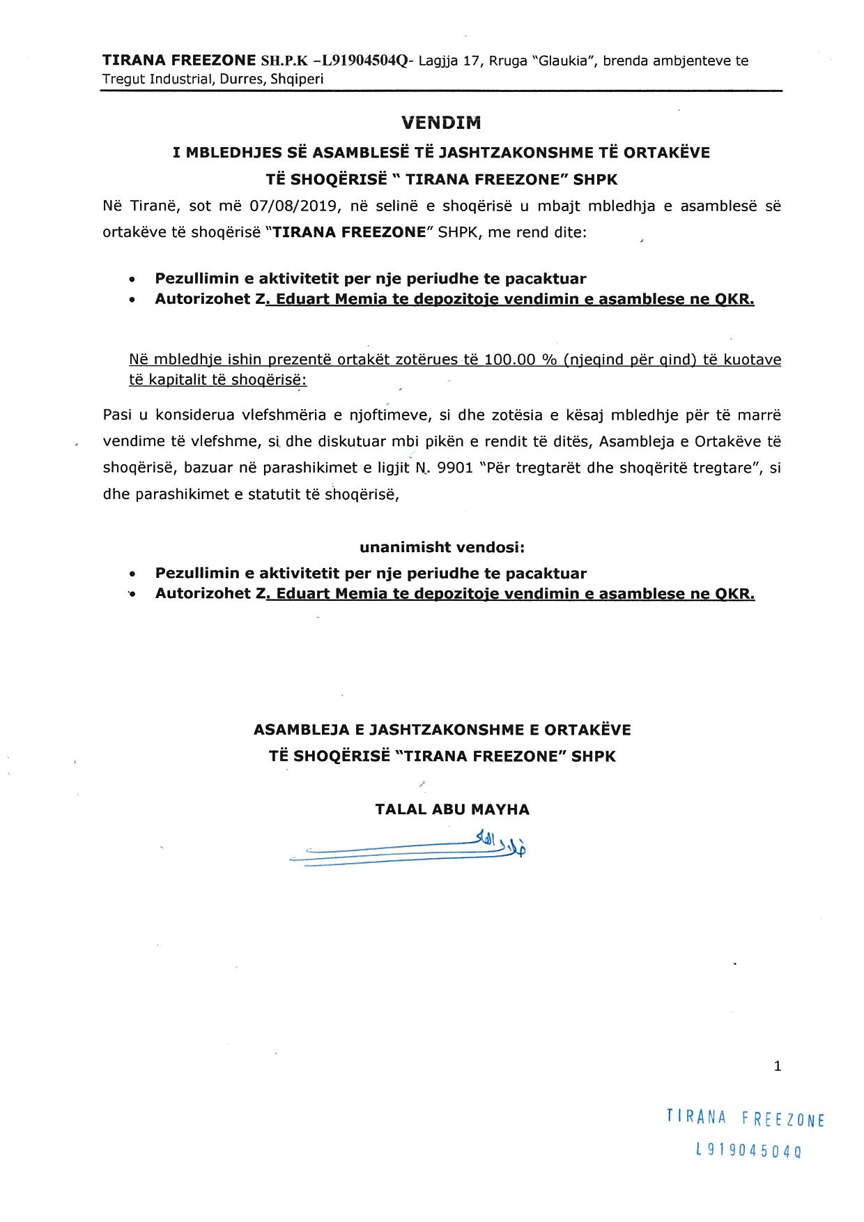 → Ekstrakti historik I regjistrit tregtar date 29.10.2019 → Statuti I Shoqerise → Vendimi I asamblese se Pergjithshme date 31.07.2019 → Vendimi I asamblese se Pergjithshme date 07.08.2019 |