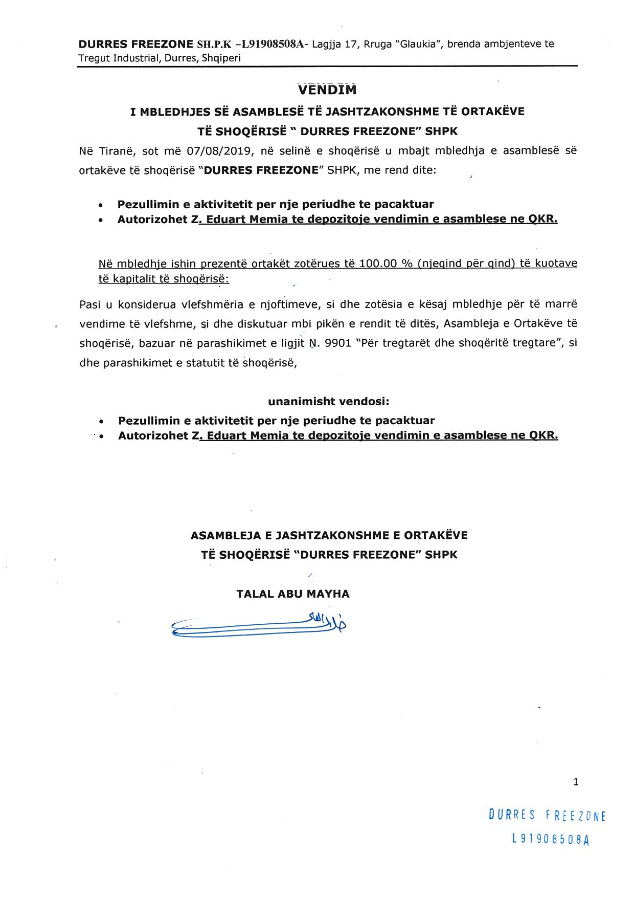 → Ekstrakti historik I regjistrit tregtar date 30.10.2019 → Statuti I Shoqerise → Vendimi I asamblese se Pergjithshme date 31.07.2019 → Vendimi I asamblese se Pergji thshme date 07.08.2019 |