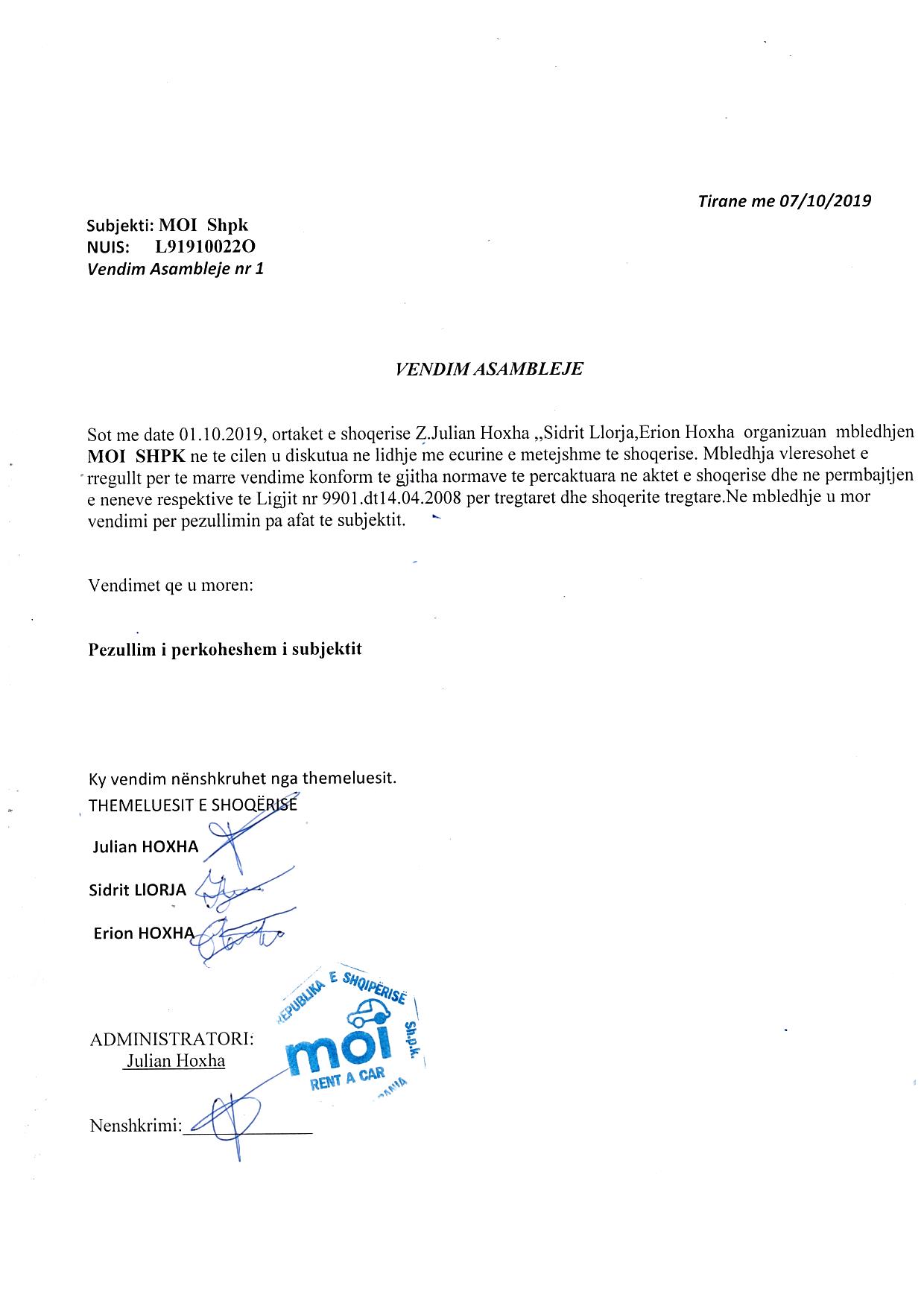 → Ekstrakti historik I regjistrit tregtar date 31.10.2019 → Statuti I Shoqerise → Vendimi I asamblese se Pergji thshme date 07.10.2019 |