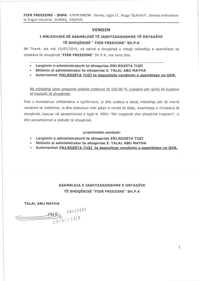 → Ekstrakti historik I regjistrit tregtar date 01.11.2019 → Statuti I Shoqerise → Vendimi I asamblese se Pergji thshme date 15.07.2019 |