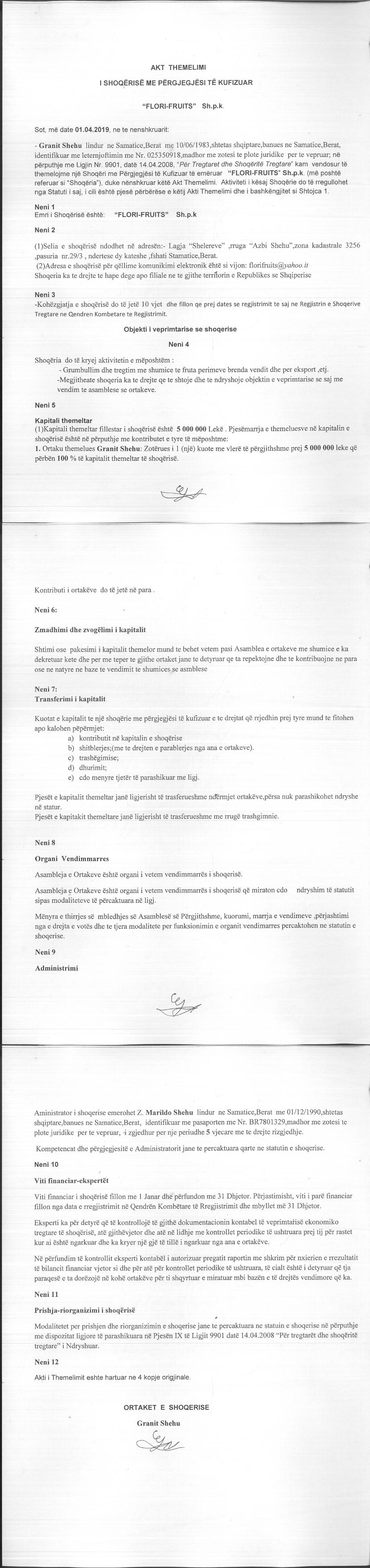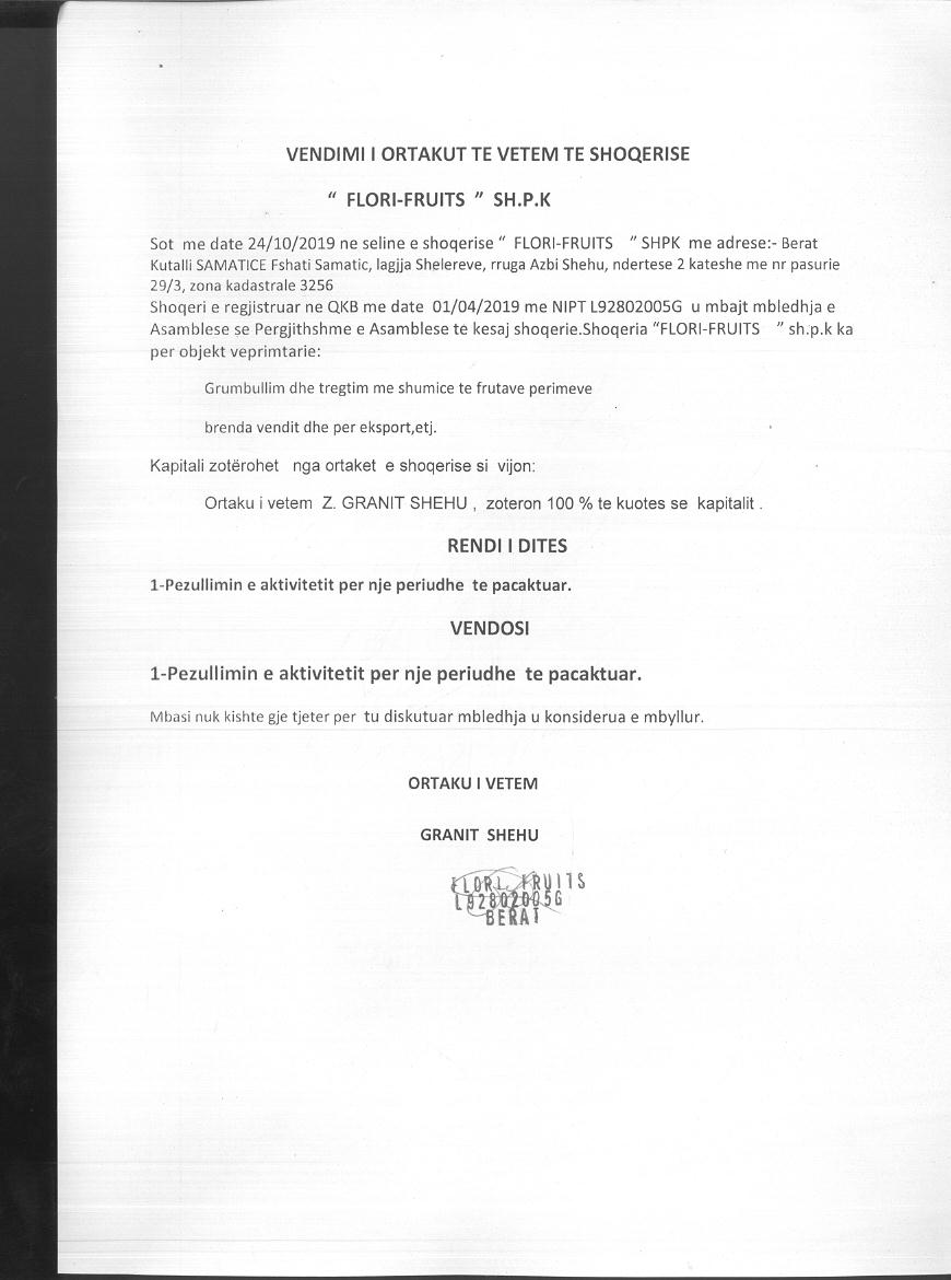 → Ekstrakt historik i regjistrit tregtar 22.01.2020 → Akti i themelimit → Vendim per pezullimin e aktivitetit 24.10.2019 → Vendim per riaktivizimin e shoqerise 03.12.2019 |
