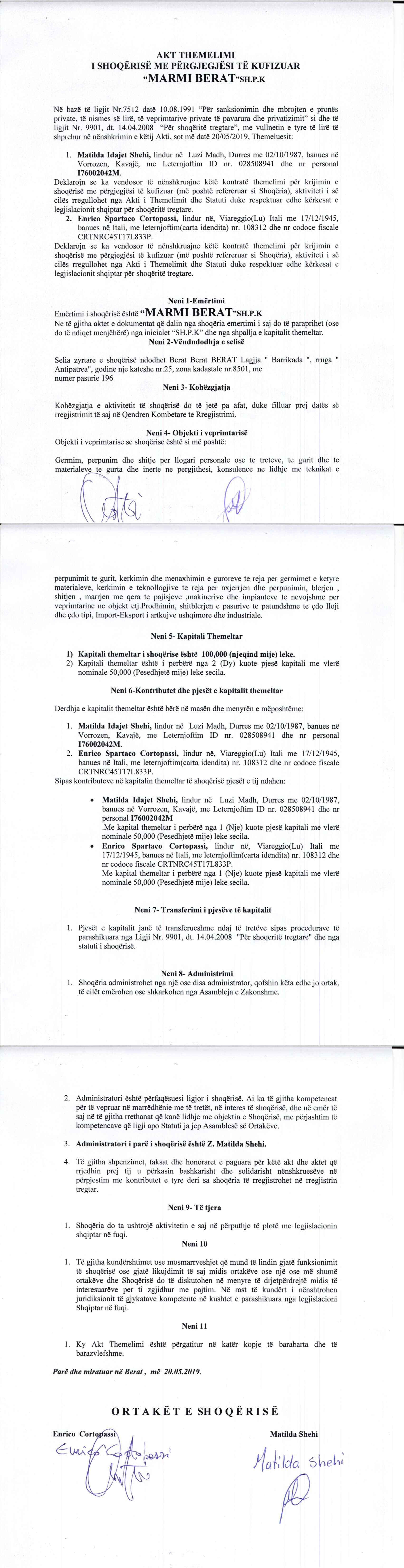 | Objekti i Veprimtarisë: | Gërmim, përpunim dhe shitje për llogari personale ose të tretëve, të gurit dhe të materialeve të gurta dhe inerte në përgjithësi, konsulencë në lidhje me teknikat e përpunimt të gurit, kërkimin dhe menaxhimin e gurorëve të reja për gërmimet e këtyre materialeve, kërkimin e teknollogjive të reja për nxjerrjen dhe përpunimin, blerjen, shitjen, marrjen me qira të pajisjeve, makinerive dhe imianteve të nevojshme për veprimtarinë në objekt etj. Prodhimin, shitblerjen e pasurive të patundshme të çdo lloji dhe çdo tipi. Import - eksport i artikujve ushqimore dhe industriale. |