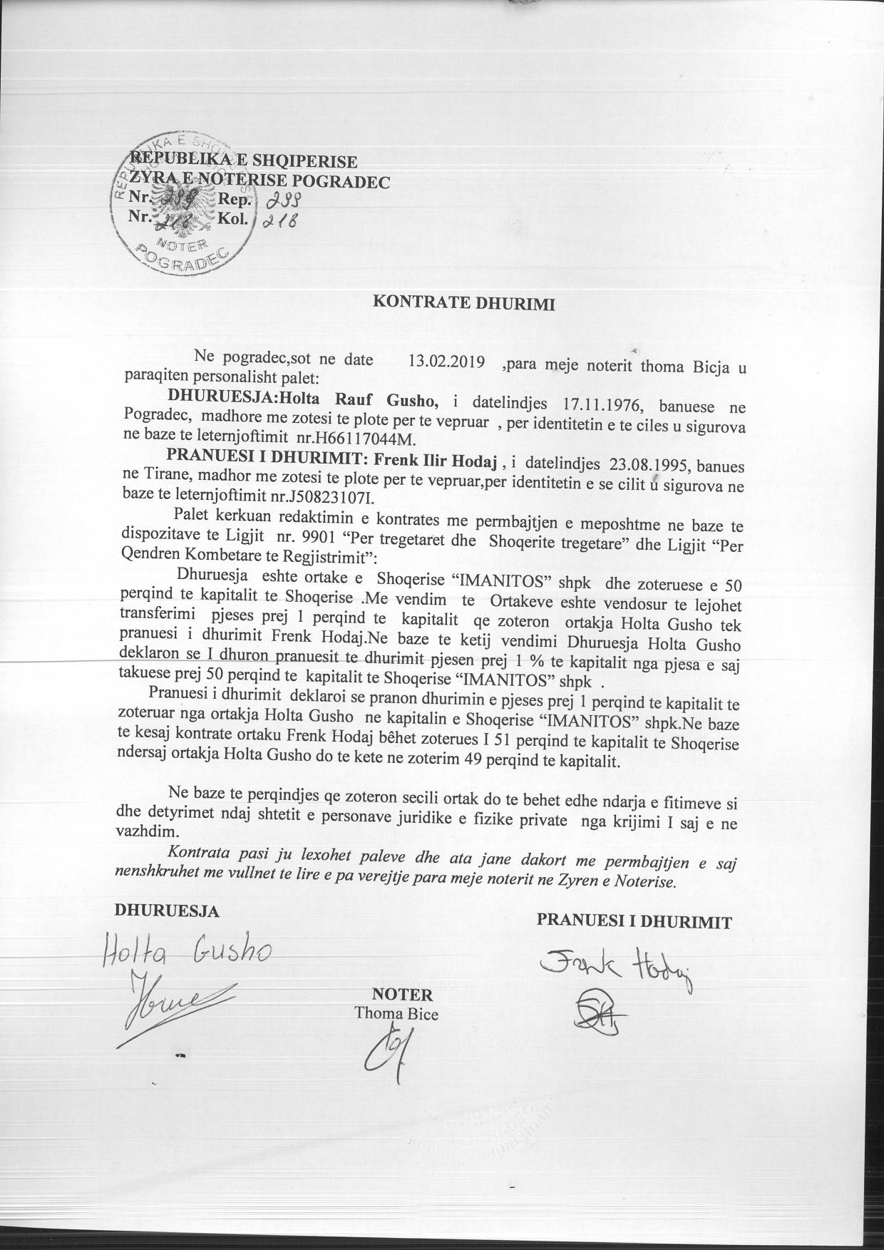 → Ekstrakt historik i regjistrit tregtar 04.12.2019 → Kontrate dhurimi kuotash 13.02.2019 |