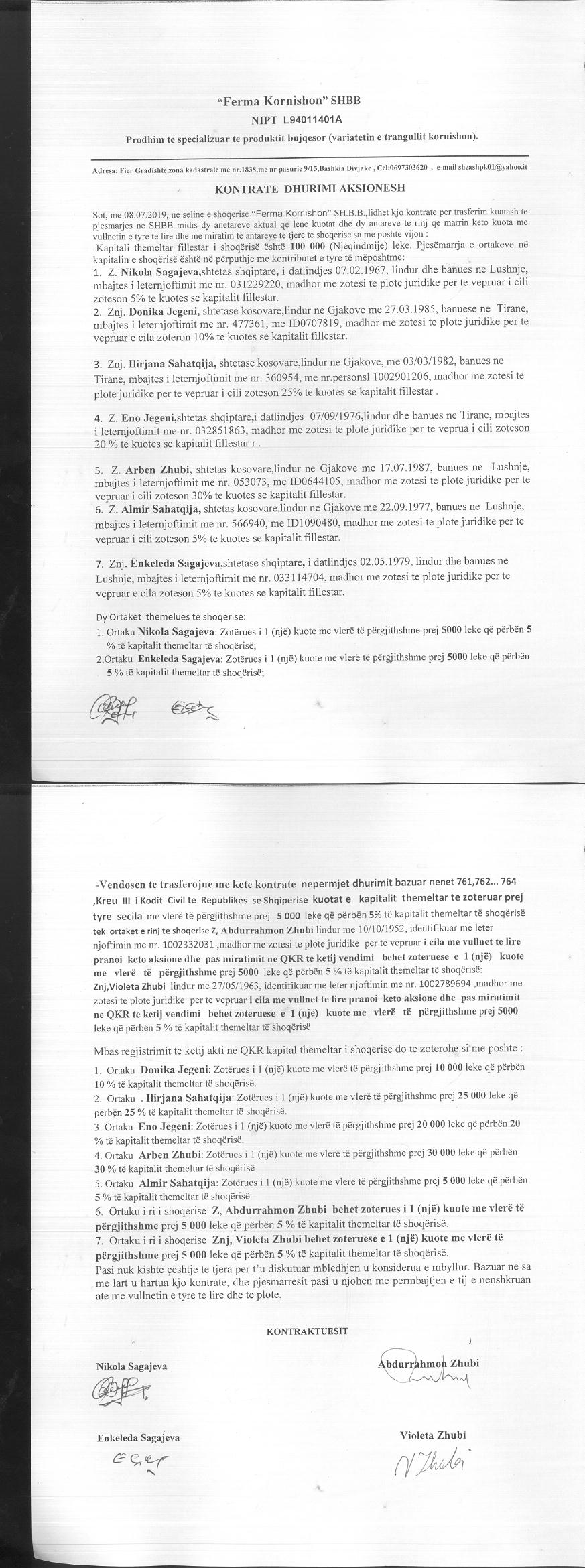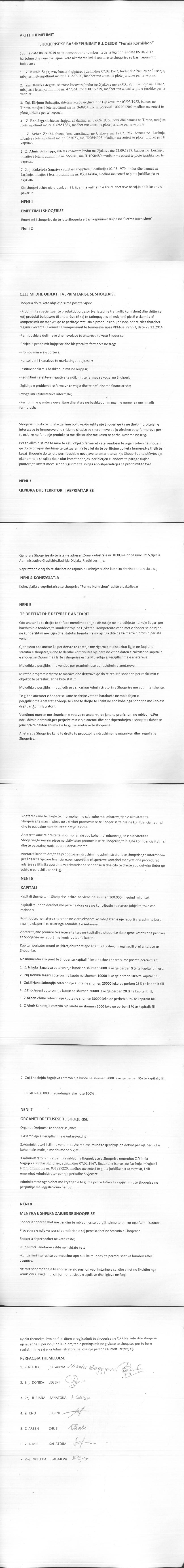 → Ekstrakt historik i regjistrit tregtar 27.01.2020 → Akti i themelimit → Kontrate dhurimi aksionesh 08.07.2019 → Ekstrakt Historik i Regjistrit Tregtar date 17.04.2024 → Të dhënat e Investimit, Financimet Nga IPARD - Aksesuar nga Agjencia për Zhvillim Bujqësor dhe Rural AZHBR datë 17.04.2024 |
