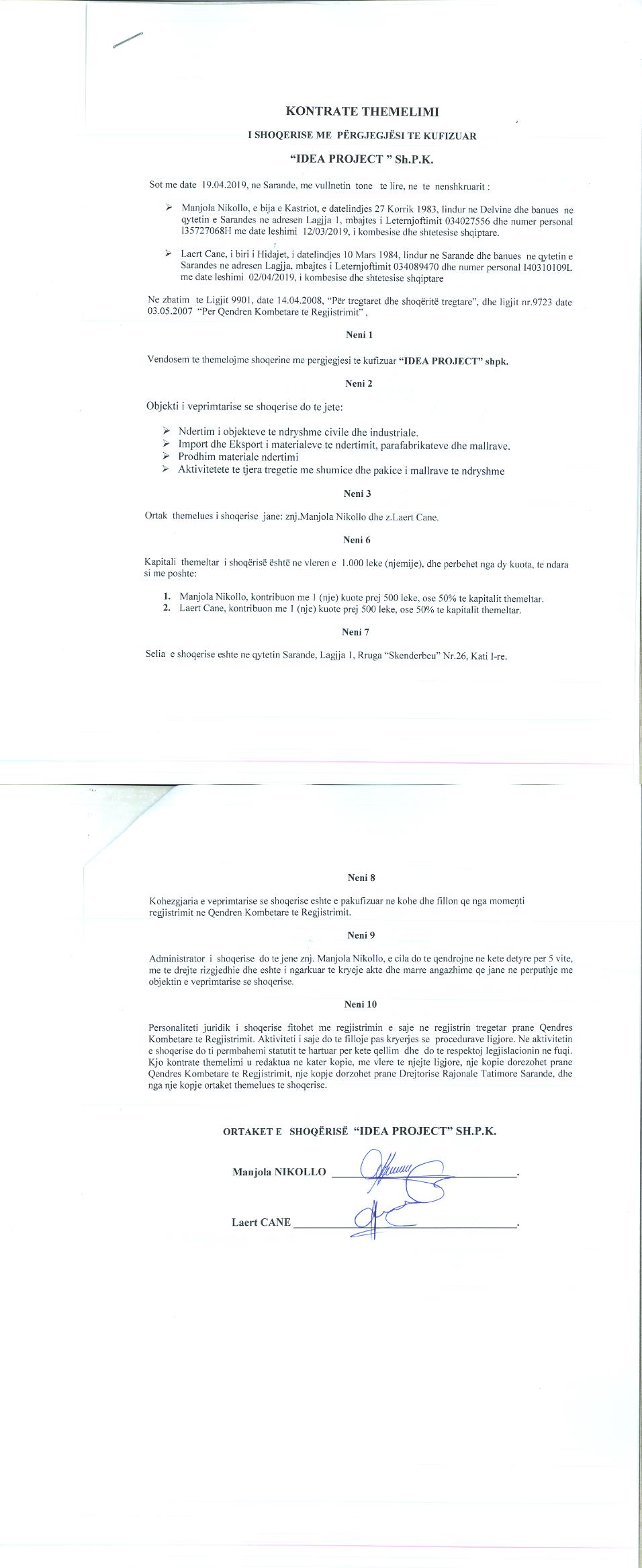 | Objekti i Veprimtarisë: | Ndërtim i objekteve të ndryshme civile dhe industriale. Import dhe Eksport i materialeve të ndërtimit, parafabrikateve dhe mallrave. Prodhim materiale ndërtimi. Aktivitete të tjera tregtie me shumicë dhe pakicë i mallrave të ndryshme. |