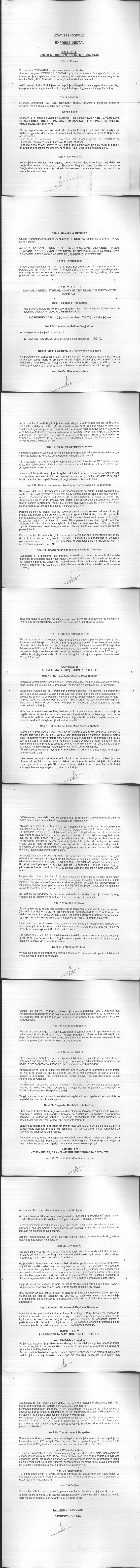 | Objekti i Veprimtarisë: | Import eksport tregti të laburanteve dentare ,pajisje dentare dhe/ose pajisje të tjera të specializuara si pltrona dentarë pjesë këmbimi auto për to ,materjale konsumi. |