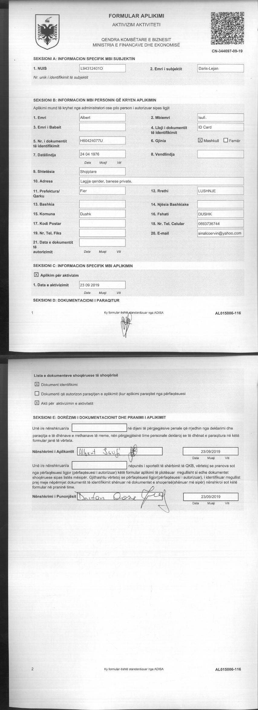 | Çështje Ligjore: | Sipas vendimit të asamblesë së përgjithshme datë 16.08.2019,është ndryshuar statusi nga aktiv në të pezulluar. Sipas kërkesës për heqje të statusit “I pezulluar”, më 23.09.2019, statusi i shoqërisë është bërë përsëri aktiv. |