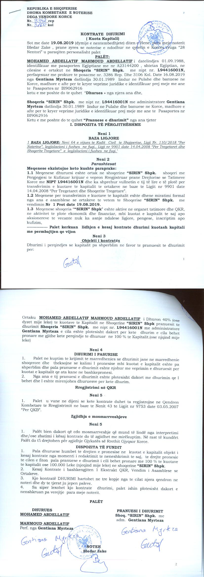 → Ekstrakti Historik I Regjistrit tregtar date 15.11.2019 → Statuti I Shoqerise → Kontrate dhurimi date 19.08.2019 |