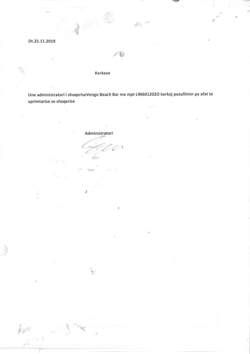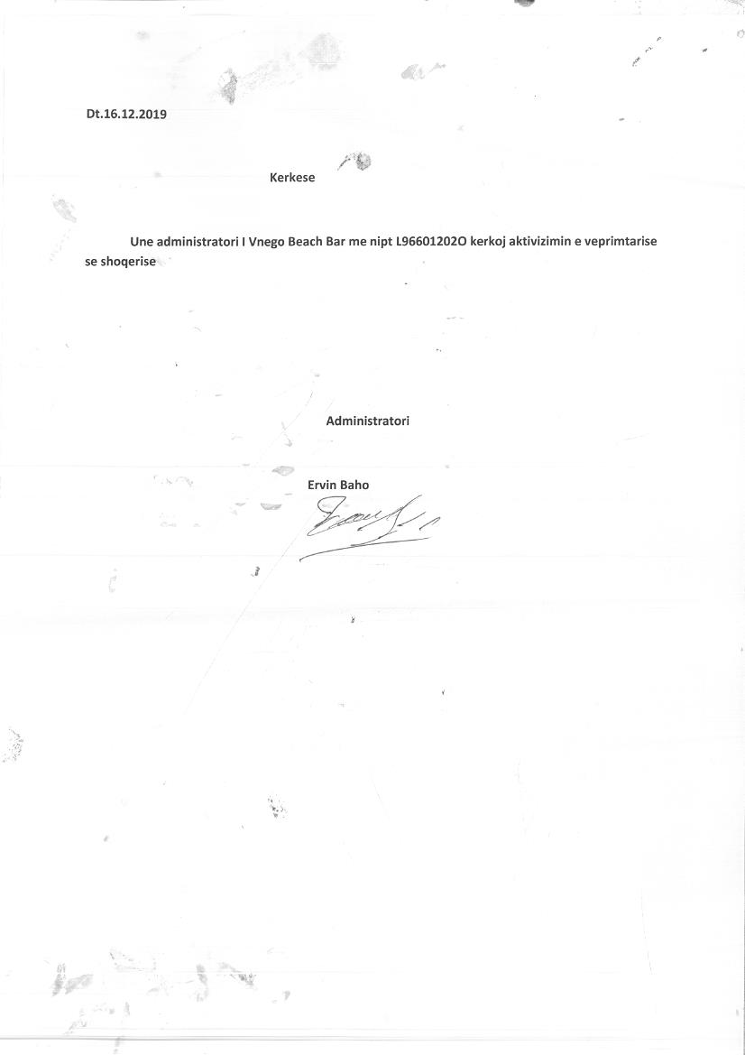 | Objekti i Veprimtarisë: | "Bar-Kafe". Veprimtaria do të konsistojë në zhvillimin, organizimin, manaxhimin, tregtimin, e festave, shfaqjeve të ndryshme me objektiv argëtimin. Në veprimtarinë e shoqërisë do të hyjë çdo aktivitet tjetër edhe në fushën e tregtisë së mallrave të ndryshëm artistik, industrial, ushqimor, ndërtimor etj, Import-Eksport që do të konsiderohen nga ortakët si të përshtatshme për arritjen e qëllimit të saj. Çdo veprim tjetër financiar e tregtar që lidhet në mënyrë të drejtepërdrejtë ose tërthorazi me objektin e veprimtarisë dhe që është në përputhje me legjislacionin në fuqi. Në veprimtarinë e shoqerise do të hyjë çdo aktivitet tjetër edhe në fushën e tregtisë së mallrave të ndryshëm artistik, industrial, ushqimor, ndërtimor etj, Import-Eksport që do të konsiderohen nga ortakët si të përshtateshme për arritjen e qëllimit të saj. Masazhe dhe veprimtari relaks. Stacion plazhi. |