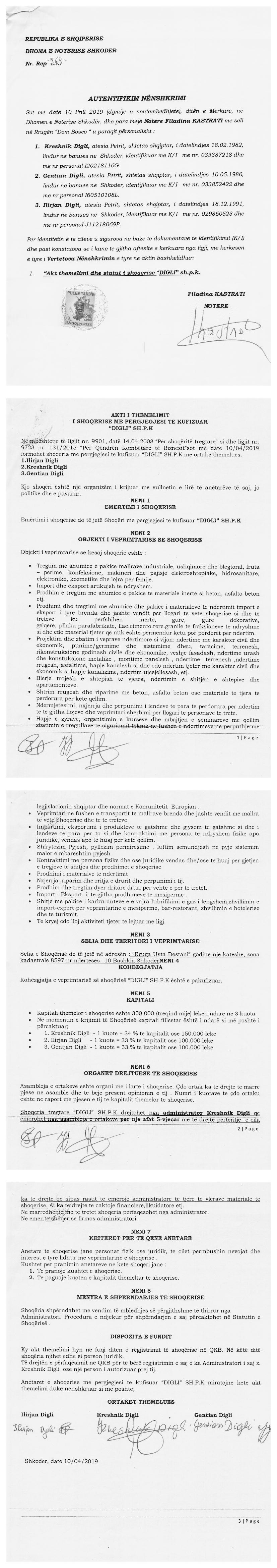 → Ekstrakt historik i regjistrit tregtar 28.01.2020 → Akti I themelimit → Kontrate shitje te pasurive te luajteshme 25.04.2019 |