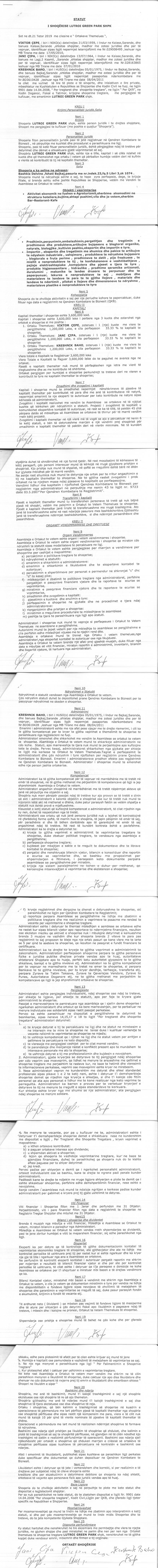 | Objekti i Veprimtarisë: | Aktivitet ekonomik ne fushen e Agroturizmit, sherbime akomodimi ne struktura hoteliere, bujtine, shtepi pushimi, vila dhe jo vetem, sherbim Bar-Restorant-Kafe. Prodhimin, perpunimin, ambalazhimin, pergatitjen dhe tregtimin e prodhimeve dhe produkteve, artikujve bujqesore e blegtoral organike, natyrale, biologjike, kultivim peshku, eksportin dhe importin e tyre. Importin, eksportin dhe tregtimin me shumice dhe pakice te artikujve te ndryshem industrial, ushqimore, produkteve te ndryshme bujqesore, blegtorale e fruta perime, prodhimeve te detit, pije freskuese, pajisje elektroshtepiake, kompjutera dhe pjeset e tjera te tyre, produkte higjenosanitare, hidraulike, prodhime qeramike artizanati, duralumini , mekanike te lendes drusore te perpunuar dhe te paperpunuar, lekures e nenprodukteve te saj, mobiljeve dhe materialeve te lendeve te par ate te gjitha llojeve, material dhe lendeve te ndertimit, pllakat e llojeve e dimensioneve te ndryshme, materialeve plastike e nenprodukteve te tyre. |