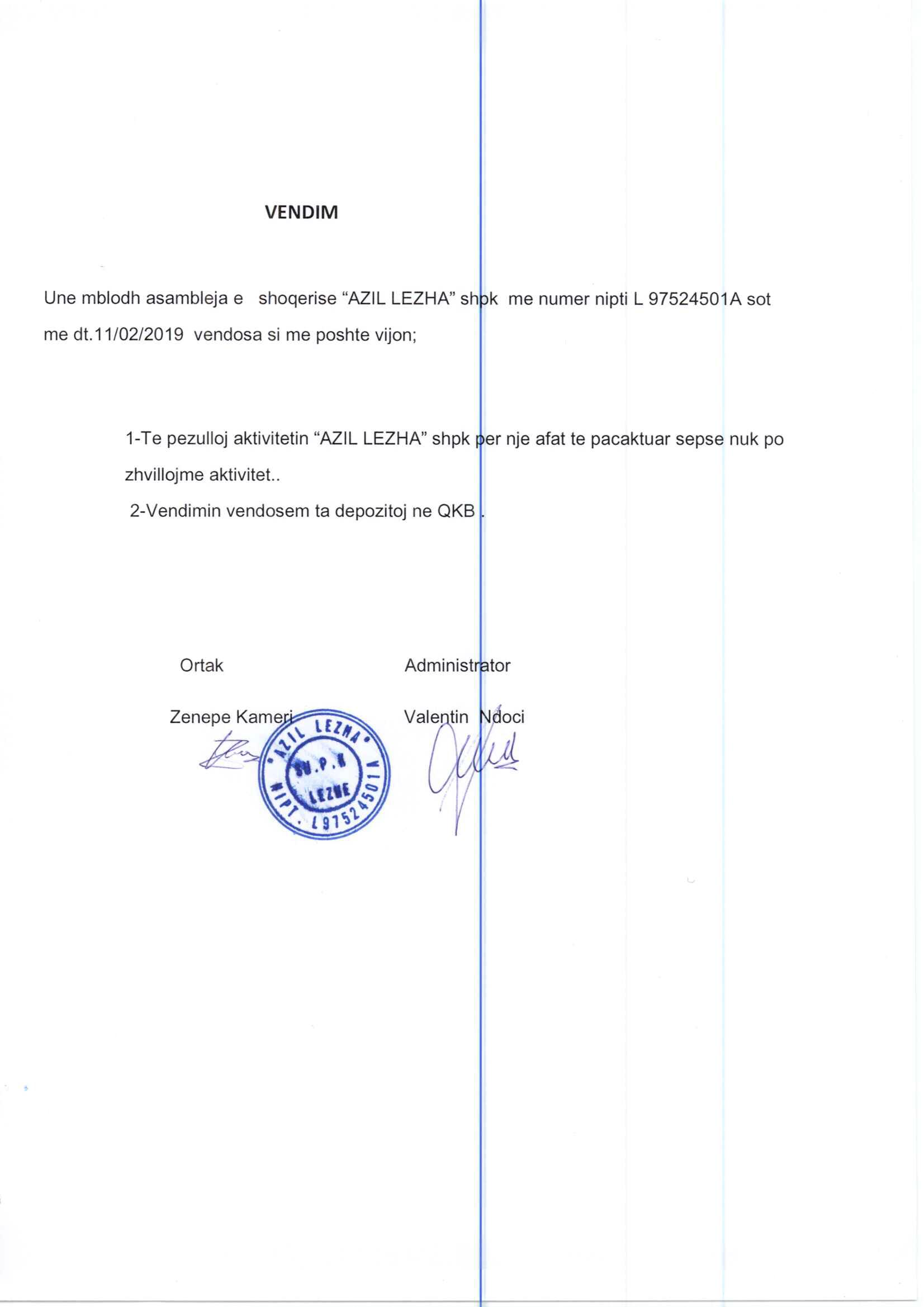 | Çështje Ligjore: | Më datë 11.02.2019, me vendim të asamblesë së ortakëve, u pezullua aktiviteti i shoqërisë për një afat të pacaktuar për shkak se shoqëria nuk po zhvillonte aktivitet. |
