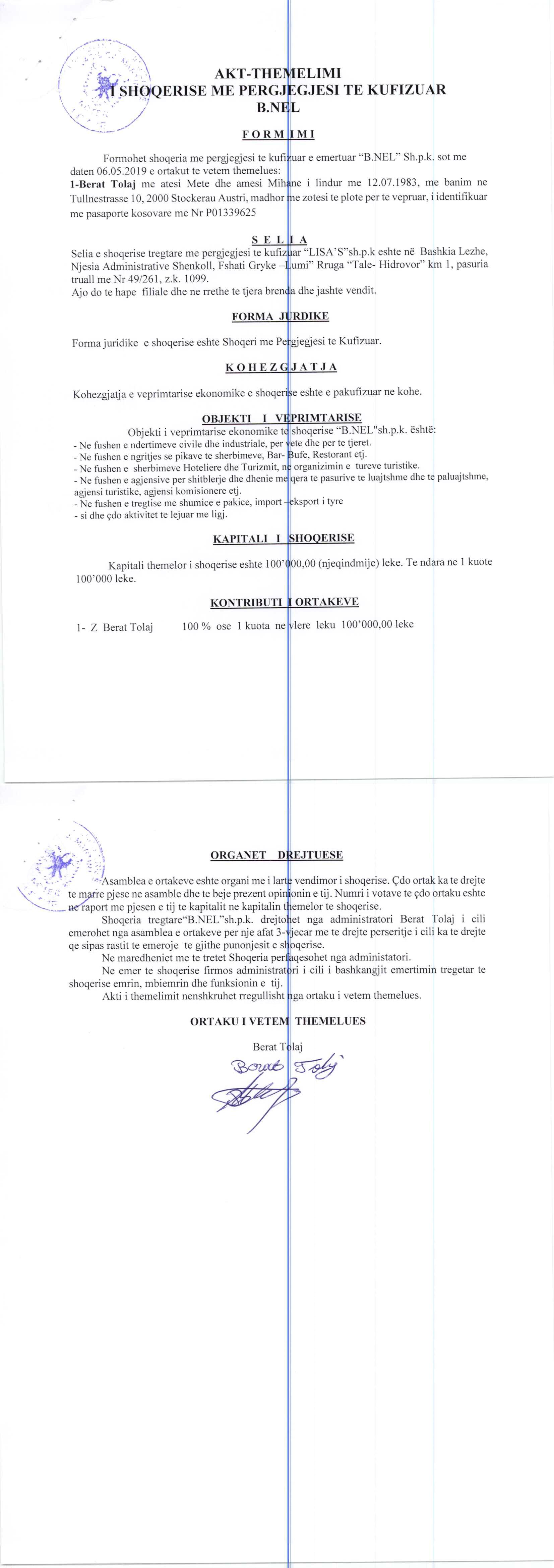 | Emërtime të tjera Tregtare: | "B. NEL " sh. p. k. |