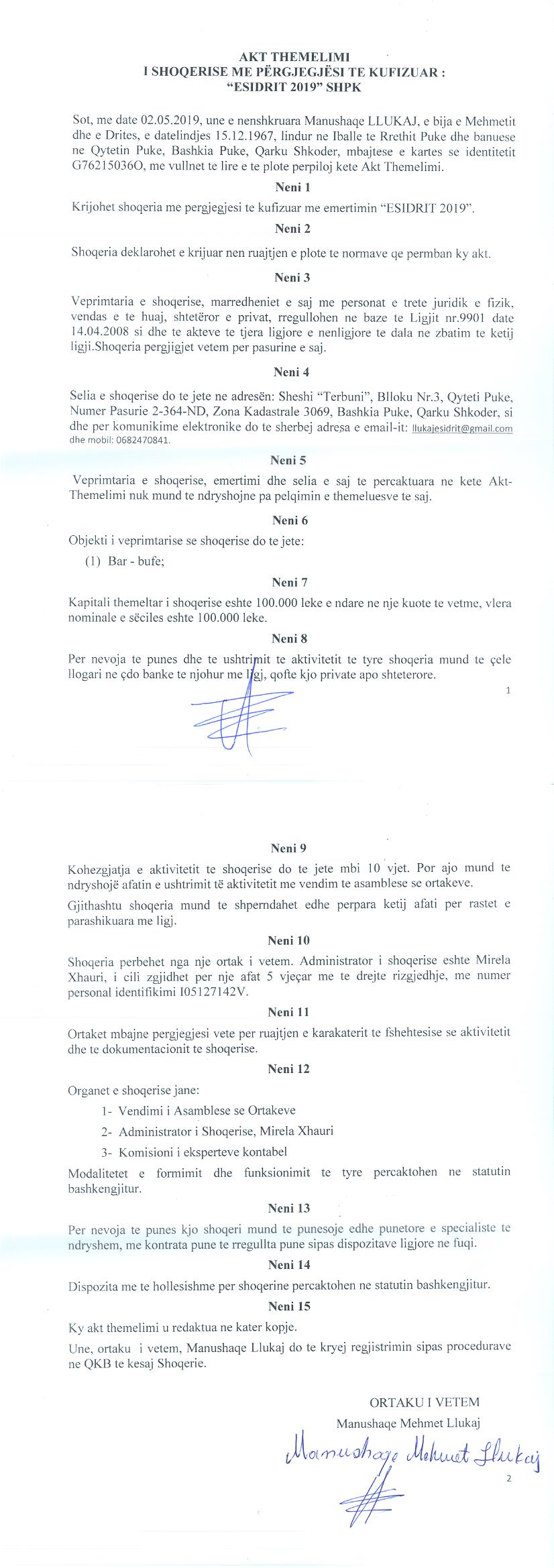 → Akti i themelimit → Ekstrakt historik i regjistrit tregtar 05.02.2020 → Akti i themelimit |