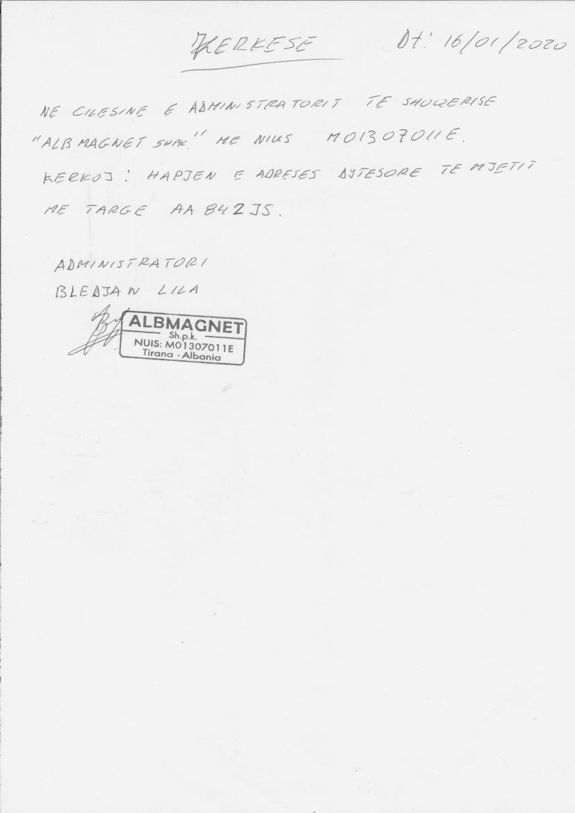 → Ekstrakti Historik i Regjistrit Tregtar date 28.03.2022 → Akt themelimi dhe Statuti i Shoqerise → Vendimi i asamblese se pergjithshme date 16.01.2020 |