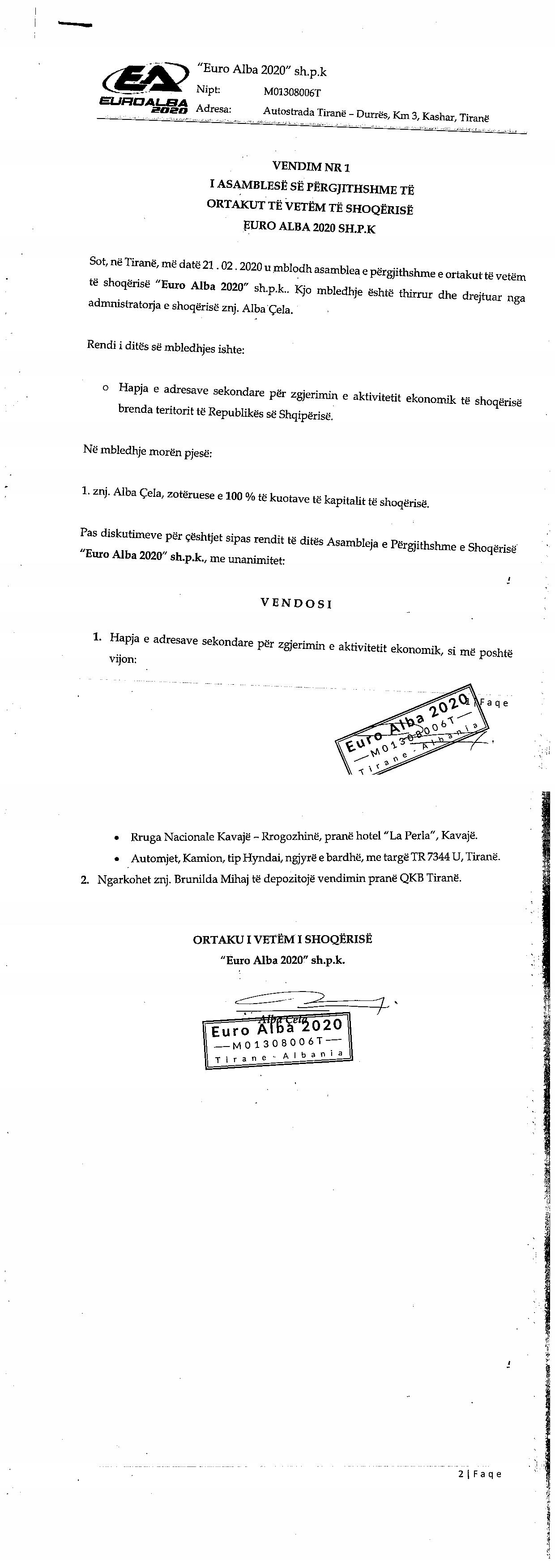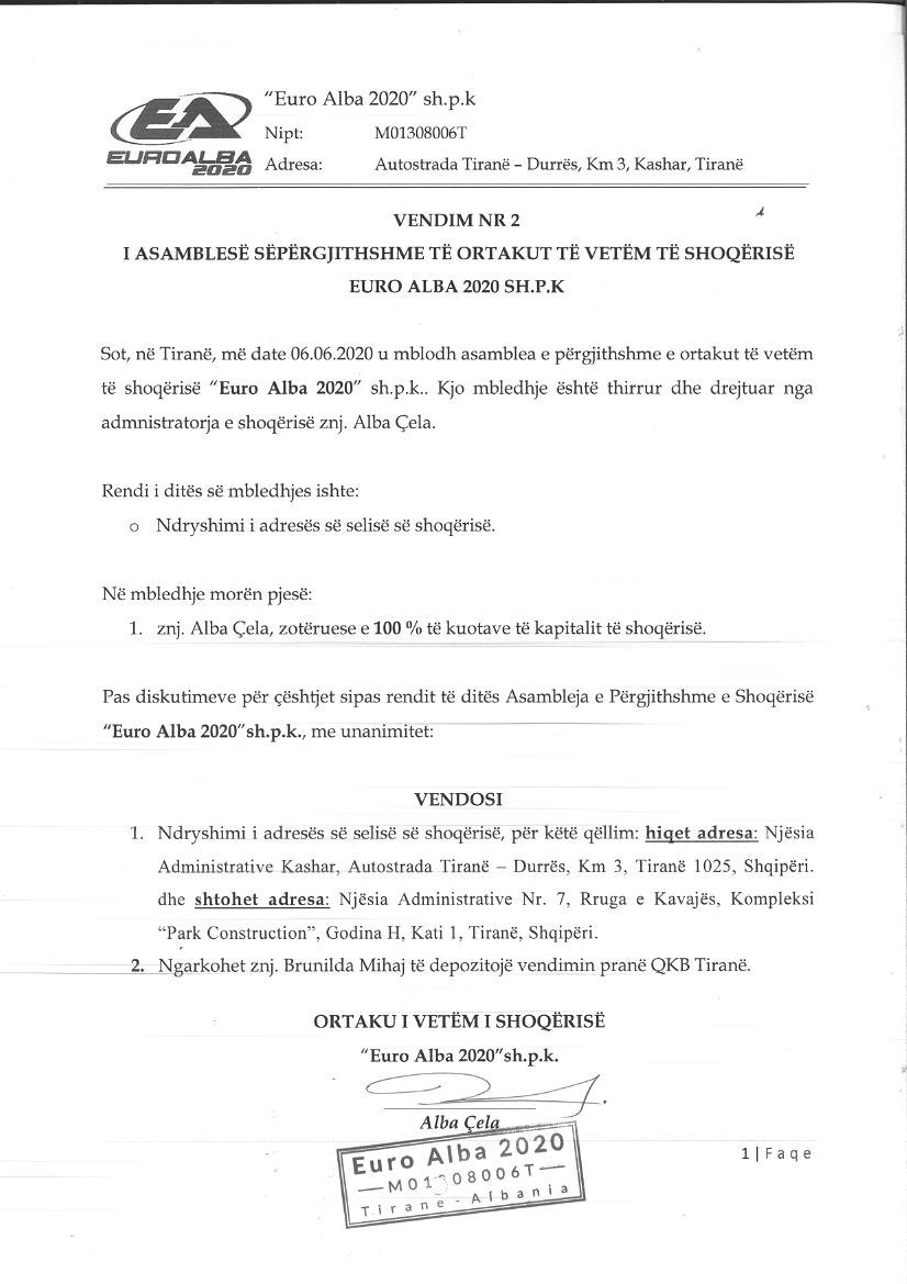 → Ekstrakti Historik i Regjistrit Tregtar date 29.03.2022 → Akt themelimi i Shoqerise → Vendimi i asamblese se pergjithshme date 21.02.2020 → Vendimi i asamblese se pergjithshme date 06.06.2020 → Vendimi i asamblese se pergjithshme date 28.06.2021 → Shenimet Shpjeguese 2020 |