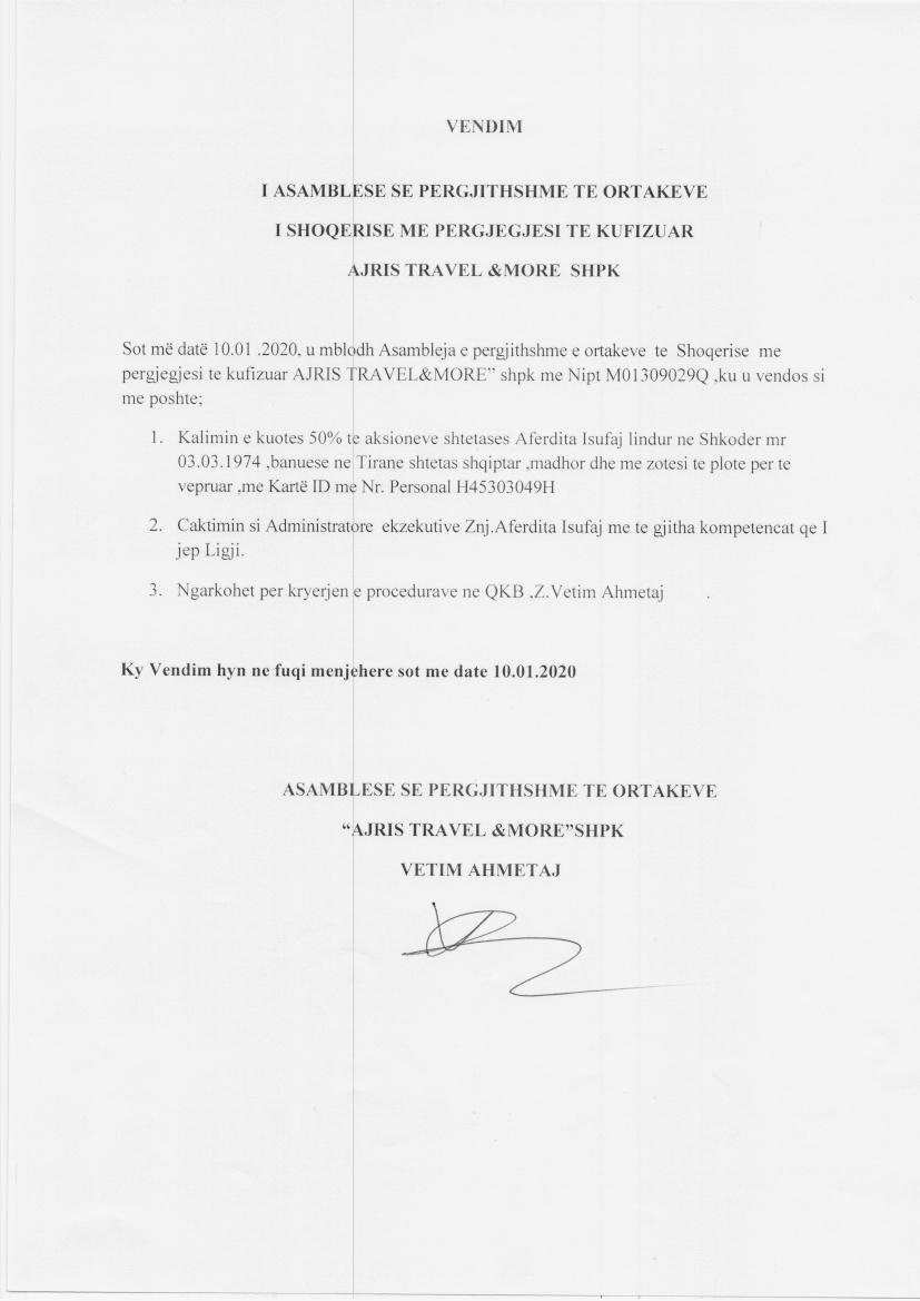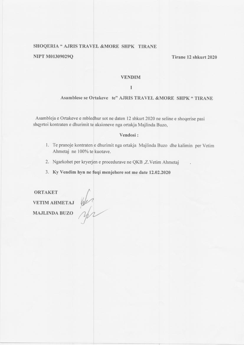 → Ekstrakti Historik i Regjistrit Tregtar date 29.03.2022 → Akt themelimi dhe Statuti i Shoqerise → Vendimi i asamblese se pergjithshme date 10.01.2020 → Kontrate shitje kuotash date 10.01.2020 → Vendimi i asamblese se pergjithshme date 16.01.2020 → Kontrate shitje kuotash date 16.01.2020 → Vendimi i asamblese se pergjithshme date 30.01.2020 → Kontrate shitje kuotash date 30.01.2020 → Vendimi i asamblese se pergjithshme date 31.01.2020 → Vendimi i asamblese se pergjithshme date 12.02.2020 → Kontrate shitje kuotash date 12.02.2020 |