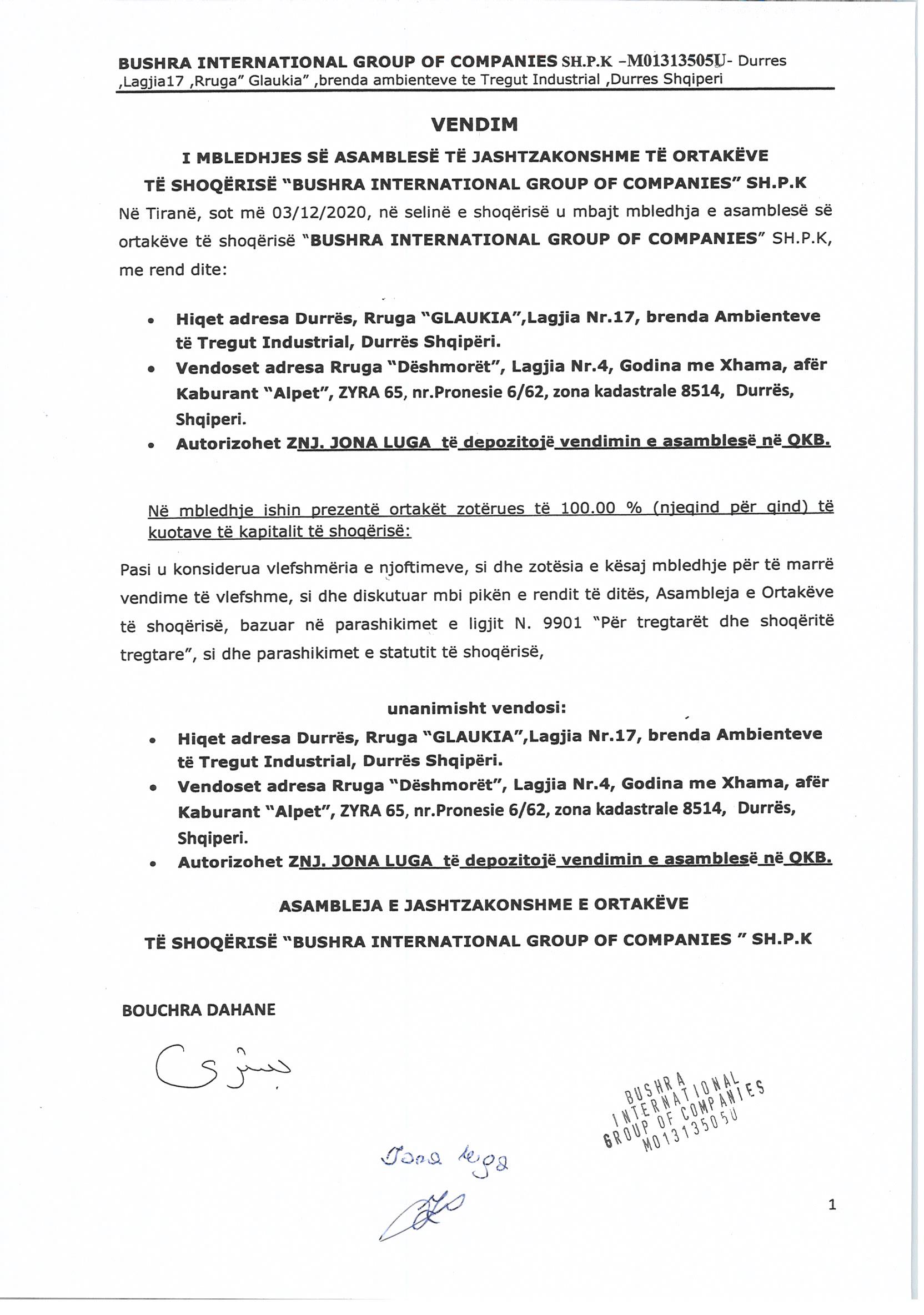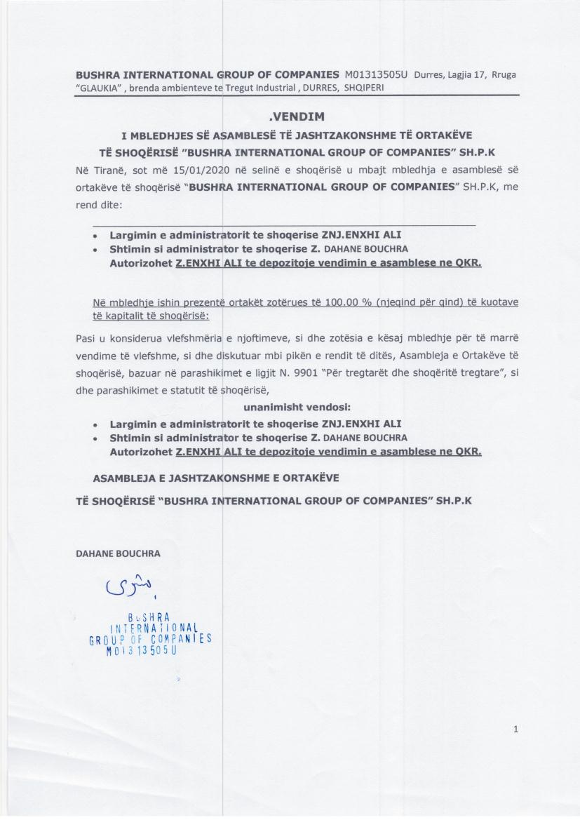→ Ekstrakti Historik i Regjistrit Tregtar date 30.03.2022 → Akt themelimi i Shoqerise → Vendimi i asamblese se pergjithshme date 15.01.2020 → Vendimi i asamblese se pergjithshme date 03.12.2020 |