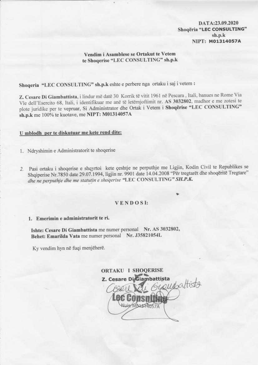 → Ekstrakti Historik i Regjistrit Tregtar date 30.03.2022 → Statuti i Shoqerise → Vendimi i asamblese se pergjithshme date 23.09.2020 |