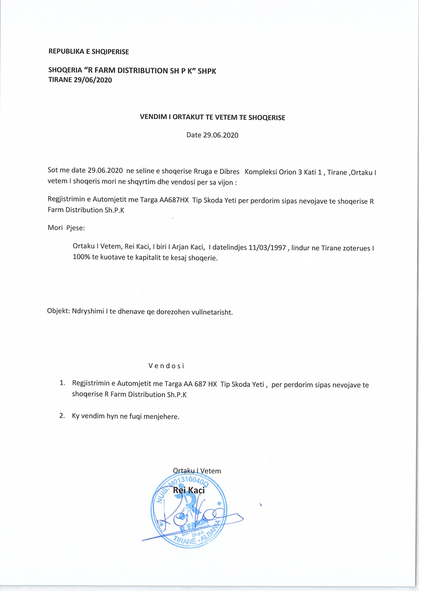 → Ekstrakti Historik i Regjistrit Tregtar date 31.03.2022 → Akt themelimi i Shoqerise → Vendimi i asamblese se pergjithshme date 29.06.2020 → Vendimi i asamblese se pergjithshme date 30.06.2021 → Vendimi i asamblese se pergjithshme date 23.02.2022 |