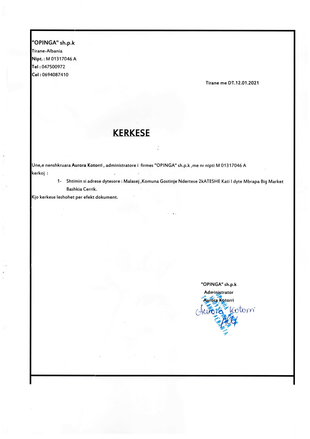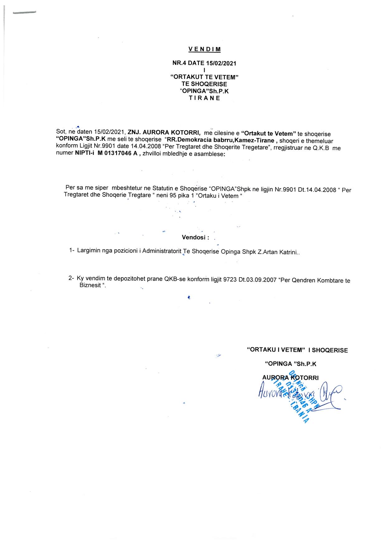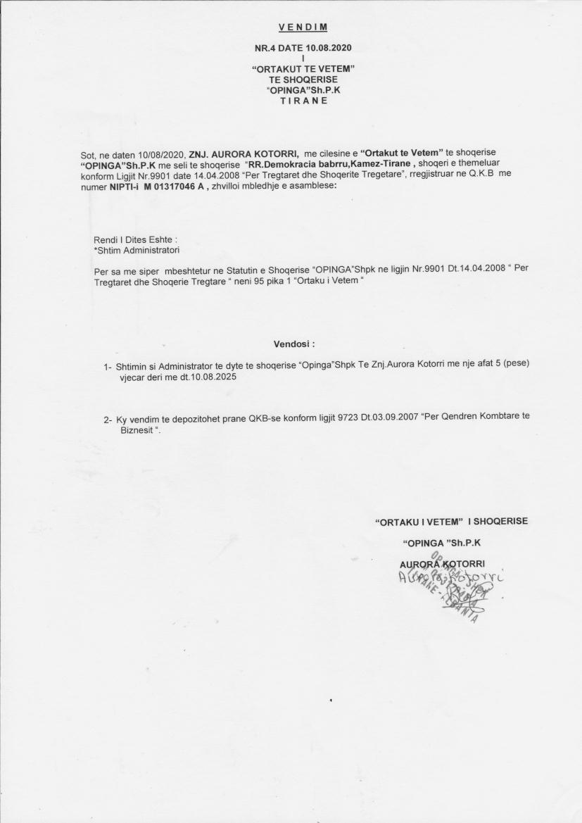 → Ekstrakti Historik i Regjistrit Tregtar date 01.04.2022 → Akt themelimi dhe Statuti i Shoqerise → Vendimi i asamblese se pergjithshme date 20.05.2020 → Vendimi i asamblese se pergjithshme date 05.08.2020 → Vendimi i asamblese se pergjithshme date 10.08.2020 → Vendimi i asamblese se pergjithshme date 25.08.2020 → Vendimi i asamblese se pergjithshme date 12.01.2021 → Vendimi i asamblese se pergjithshme date 15.02.2021 → Vendimi i asamblese se pergjithshme date 12.05.2021 |