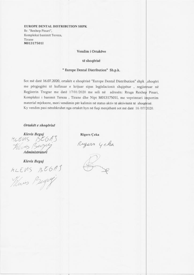 → Ekstrakti Historik i Regjistrit Tregtar date 01.04.2022 → Akt themelimi i Shoqerise → Vendimi i asamblese se pergjithshme date 21.04.2020 → Vendimi i asamblese se pergjithshme date 16.07.2020 → Vendimi i asamblese se pergjithshme date 17.05.2021 |