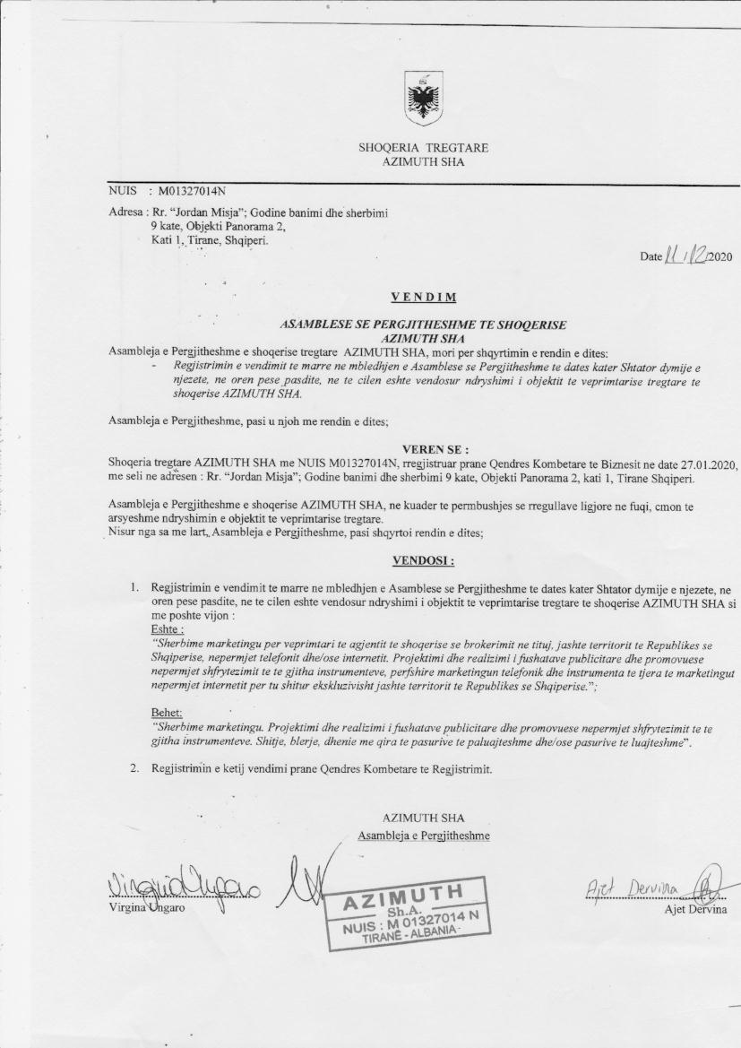 → Ekstrakti Historik i Regjistrit Tregtar date 06.04.2022 → Akt themelimi i Shoqerise → Vendimi i asamblese se pergjithshme date 11.12.2020 → Raport i Administratorit te Shoqerise date 21.12.2021 → Raport Audituesi per Shnderrimin e Shoqerise nga SH.A ne SH.P.K date 23.12.2021 → Statuti i Shoqerise date 24.12.2021 → Vendimi i asamblese se pergjithshme date 24.12.2021 → Statuti i Ri i Shoqerise i ndryshuar date 16.02.2022 → Vendimi i asamblese se pergjithshme date 16.02.2022 |