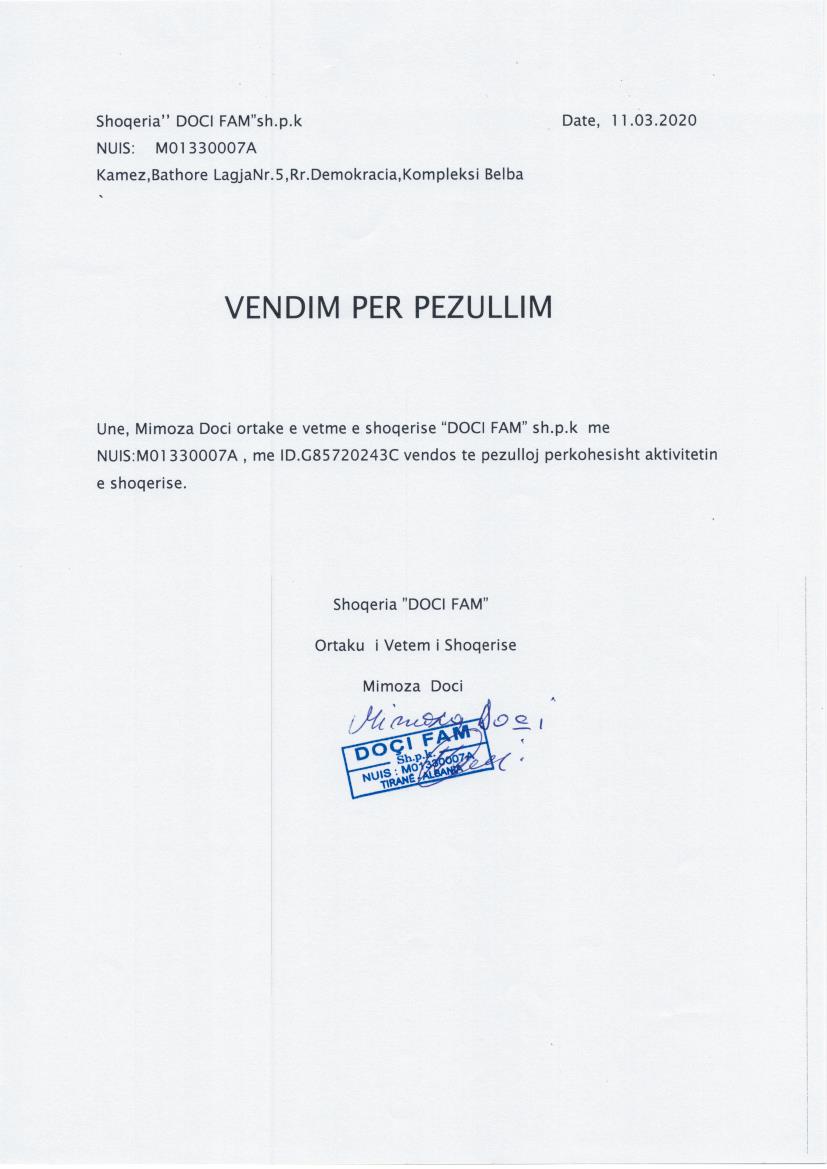 | Çështje Ligjore: | Sipas vendimit te asamblese se pergjithshme date 11.03.2020 ka ndodhur ndryshimi i statusit nga "Aktiv" ne "Pezulluar". |