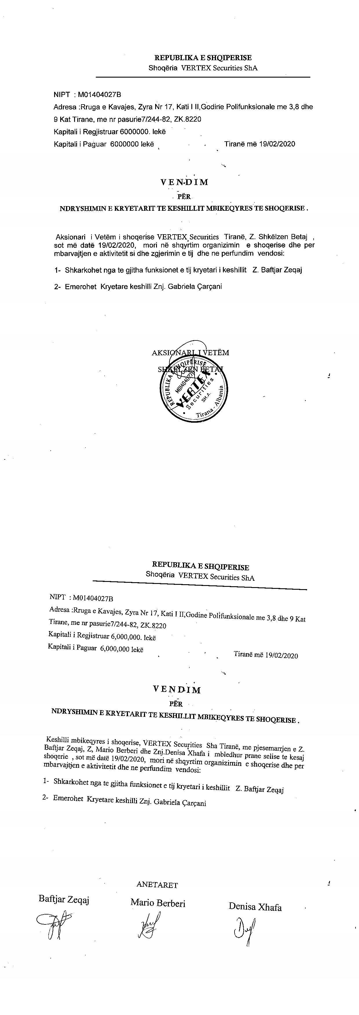 | Anëtarë Bordi: | Gabriela Çarçani; Denisa Xhafa; Fatjon Hysa |